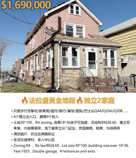 该物业属于R4 zoning规划区域,具备可加建扩展空间,整体结构灵活,适合投资改造或长期持有收租,是法拉盛稀缺的多收入型物业之一。