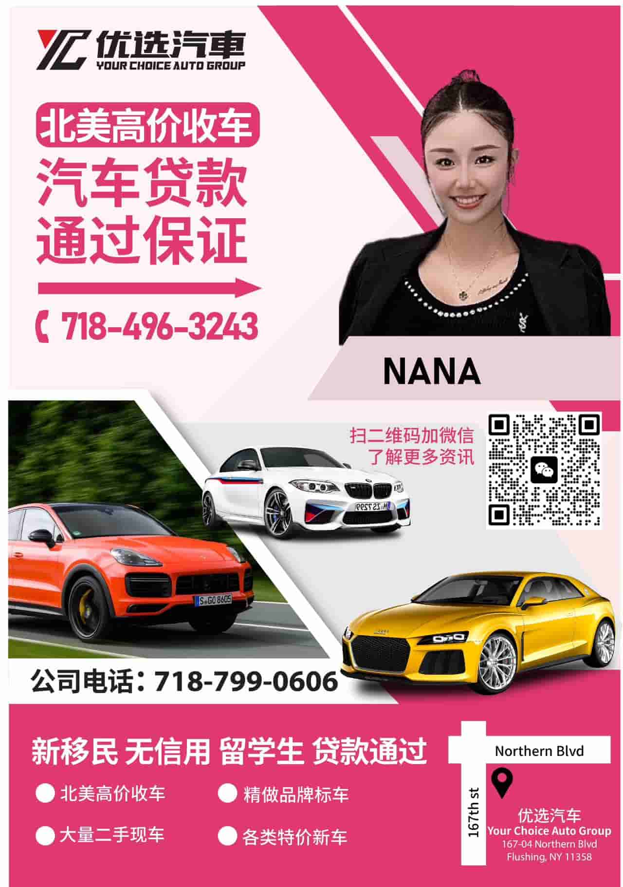 NANA 718-496-3243 地址 167-04 Northern Blvd, Flushing, NY 11358口碑第一 优选汽车Your Choice Auto Group纽约优选汽车买卖销售经理NANA 7184963243 法拉盛优选汽车金牌经理人NANA 高价现金回收二手车