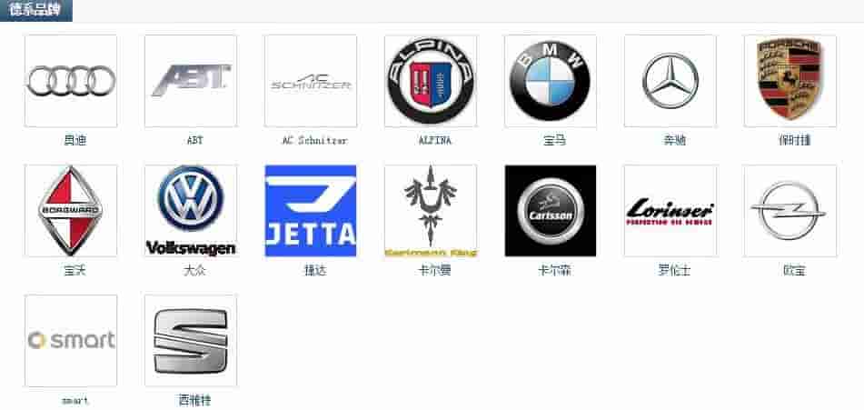 第一行:奥迪、ABT、AC Schnitzer、ALPINA、宝马、奔驰、保时捷