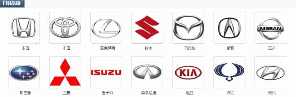 第二行: 斯巴鲁、三菱、五十铃、英菲尼迪、起亚、双龙、现代