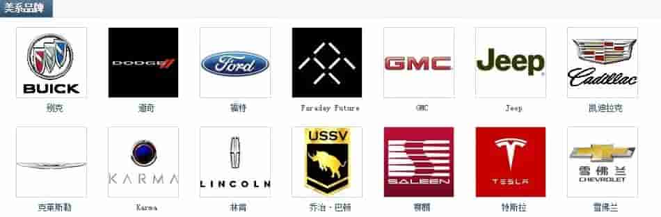 第一行:别克、道奇、福特、FF(法拉第未来)、GMC、Jeep、凯迪拉克