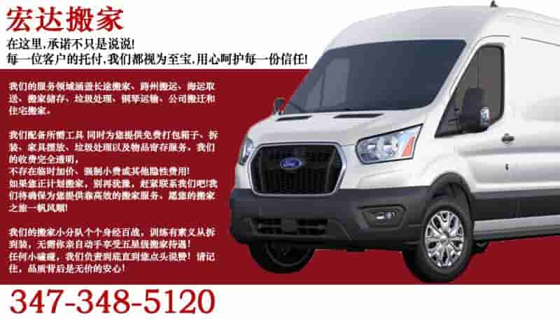 宏达搬家 #1纽约宏达搬家 纽约搬家公司推荐 我们宏达搬家的服务领域涵盖长途搬家 跨州搬运 海运取送 搬家储存 垃圾处理 钢琴运输 公司搬迁和住宅搬家3473485120