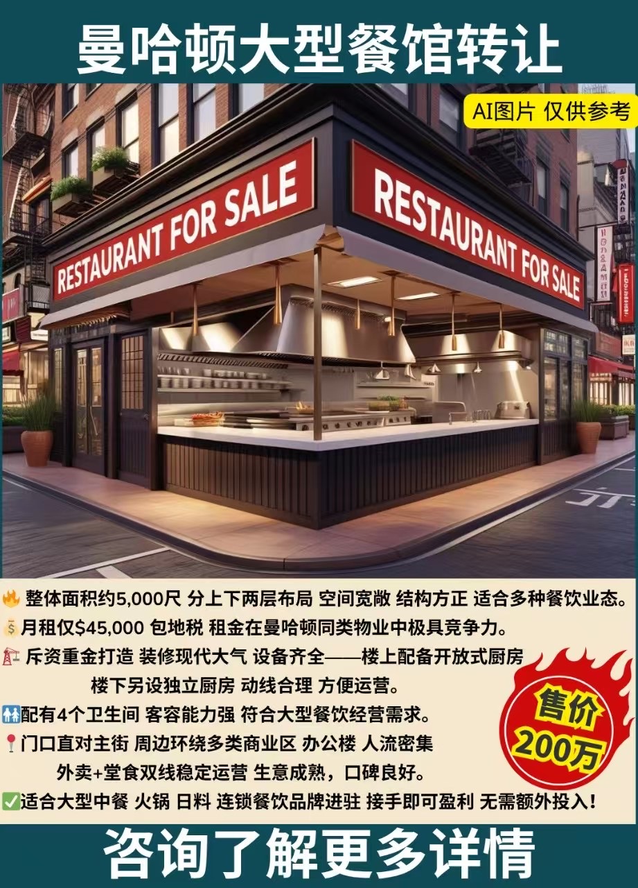 独家代理欢迎合作转发曼哈顿大型餐馆转让整体面积约5,000尺分上下两层,有两个厨房,4个卫生间