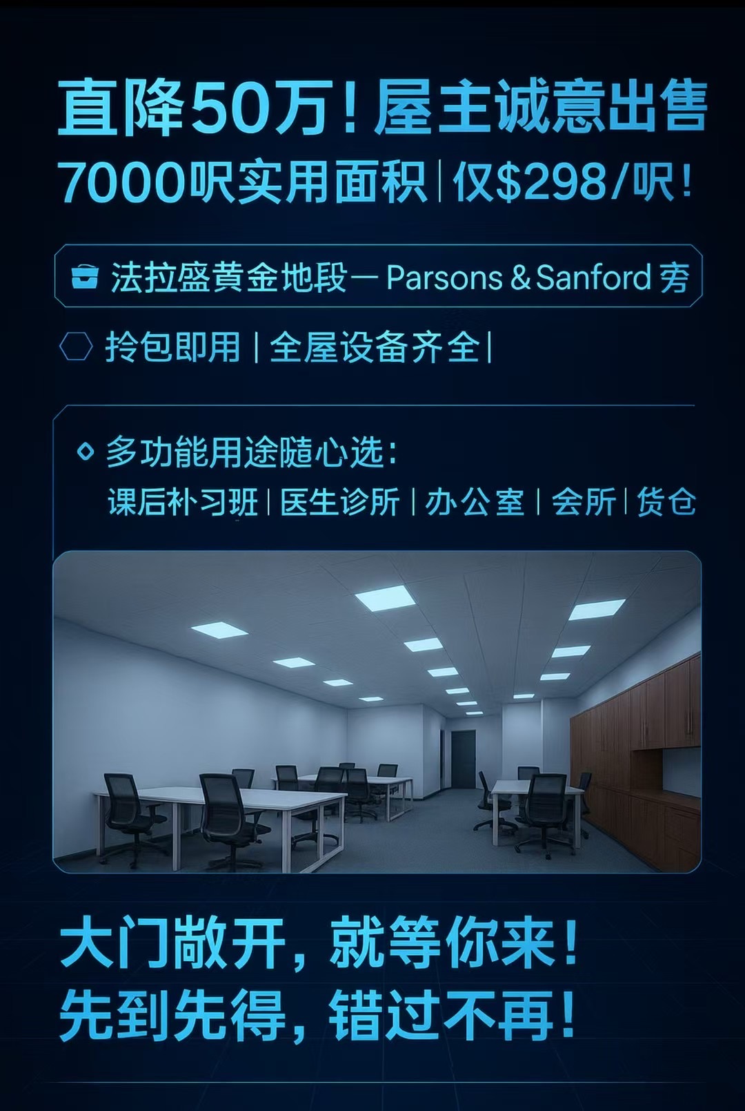 喜欢捡漏的看过来 🏷 直降50万!屋主诚意出售!💼 7000呎实用面积|仅$298/呎!📍 法拉盛黄金地段 — Parsons & Sanford 旁✨ 拎包即用🔹 多功能用途随心选:
