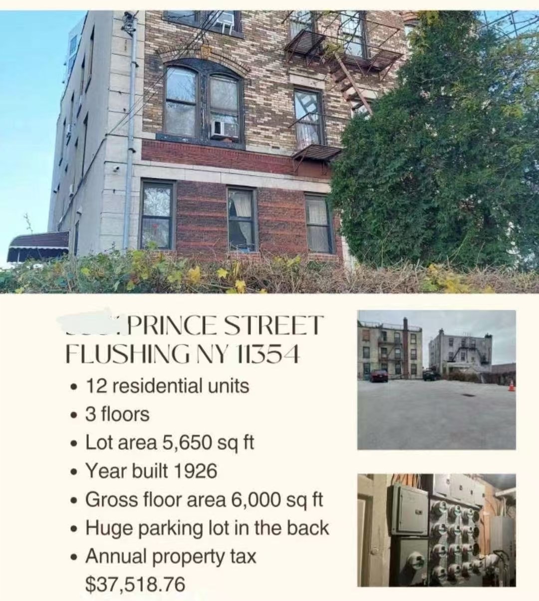 🏠法拉盛出售王子街Flushing 独栋多家庭地址🏠:33XX Prince street, NY 11354🪄室内面积6000尺,(不含地下室)。🔥地10000尺🔥🪄12 套单位🪄后园是停车场。🪄近学校、公园、走路到7号地铁到曼哈顿和多条路线巴士直达皇后区不同的地点。周边各式餐厅和华人超市。生活超级便利,周边设施齐全投资自住首选。💰降价了,请出价,价高者得,要快!!