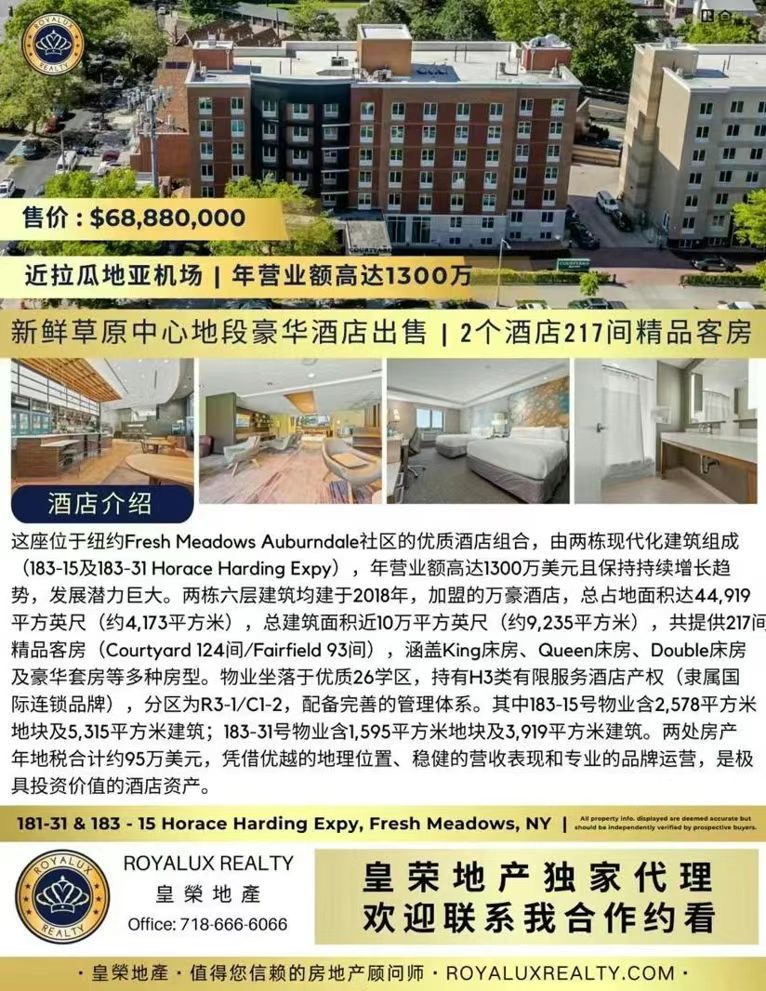 这座位于纽约Fresh Meadows Auburndale社区的优质酒店组合,由两栋现代化建筑组成(183-15及183-31 Horace Harding Expy),年营业额高达1300万美元且保持持续增长趋势,发展潜力巨大。两栋六层建筑均建于2018年,加盟的万豪酒店,总占地面积达44,919平方英尺(约4,173平方米),总建筑面积近10万平方英尺(约9,235平方米),共提供217间精品客房(Courtyard 124间/Fairfield 93间),涵盖King床房、Queen床房、Double床房及豪华套房等多种房型。物业坐落于优质26学区,持有H3类有限服务酒店产权(隶属国际连锁品牌),分区为R3-1/C1-2,配备完善的管理体系。其中183-15号物业含2,578平方米地块及5,315平方米建筑;183-31号物业含1,595平方米地块及3,919平方米建筑。两处房产年地税合计约95万美元,凭借优越的地理位置、稳健的营收表现和专业的品牌运营,是极具投资价值的酒店资产。