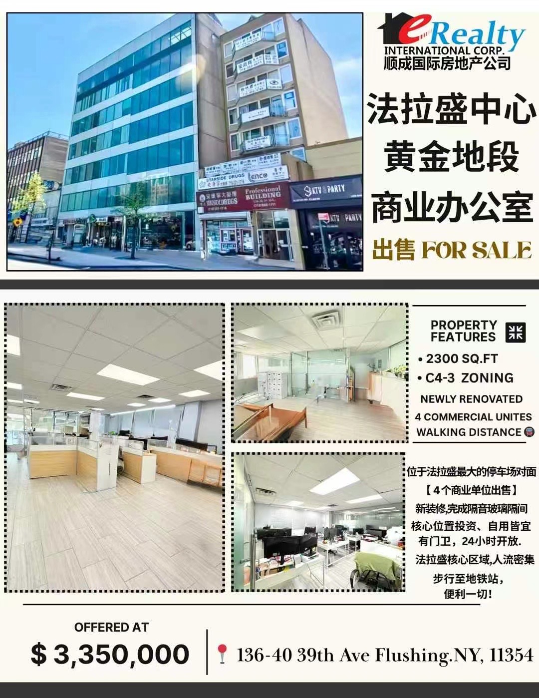 法拉盛中心39Ave|4个商业办公室出售|👏共约2300尺,可灵活购买或出租 ~ 可谈 👏|黃金位置、人流量大.适合各类专业办公室、律师、会计、保险 、移民、 地产、旅游等