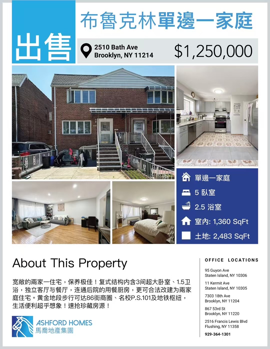 馬喬地產集團獨家代理 布鲁克林一家庭独栋出售 靠近地铁 配车库后院Brooklyn独立一家庭住宅出售 安静街区 生活便利