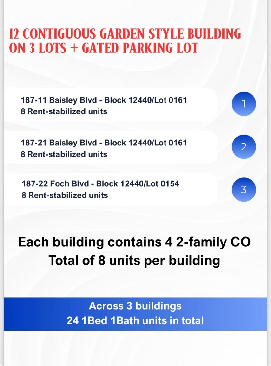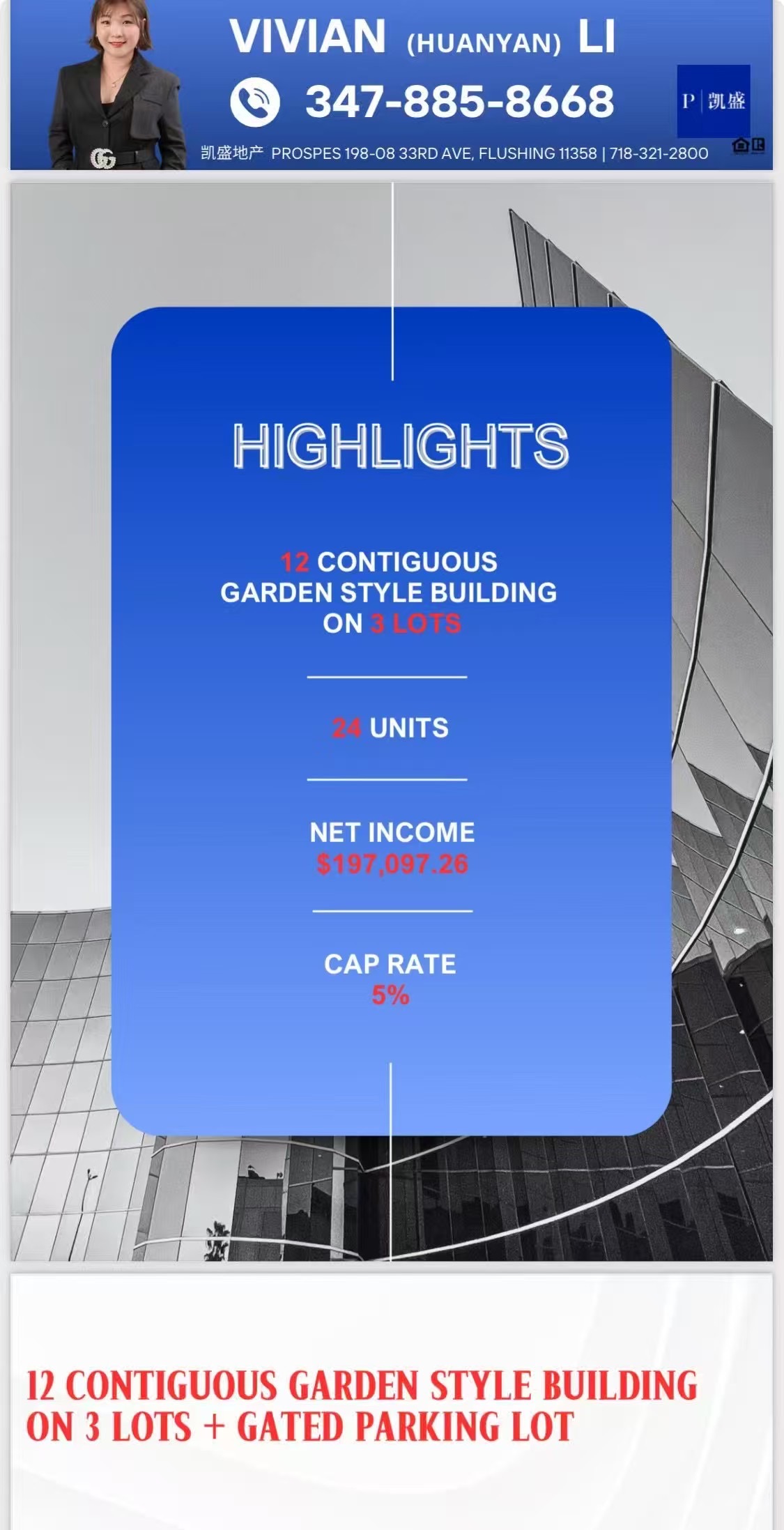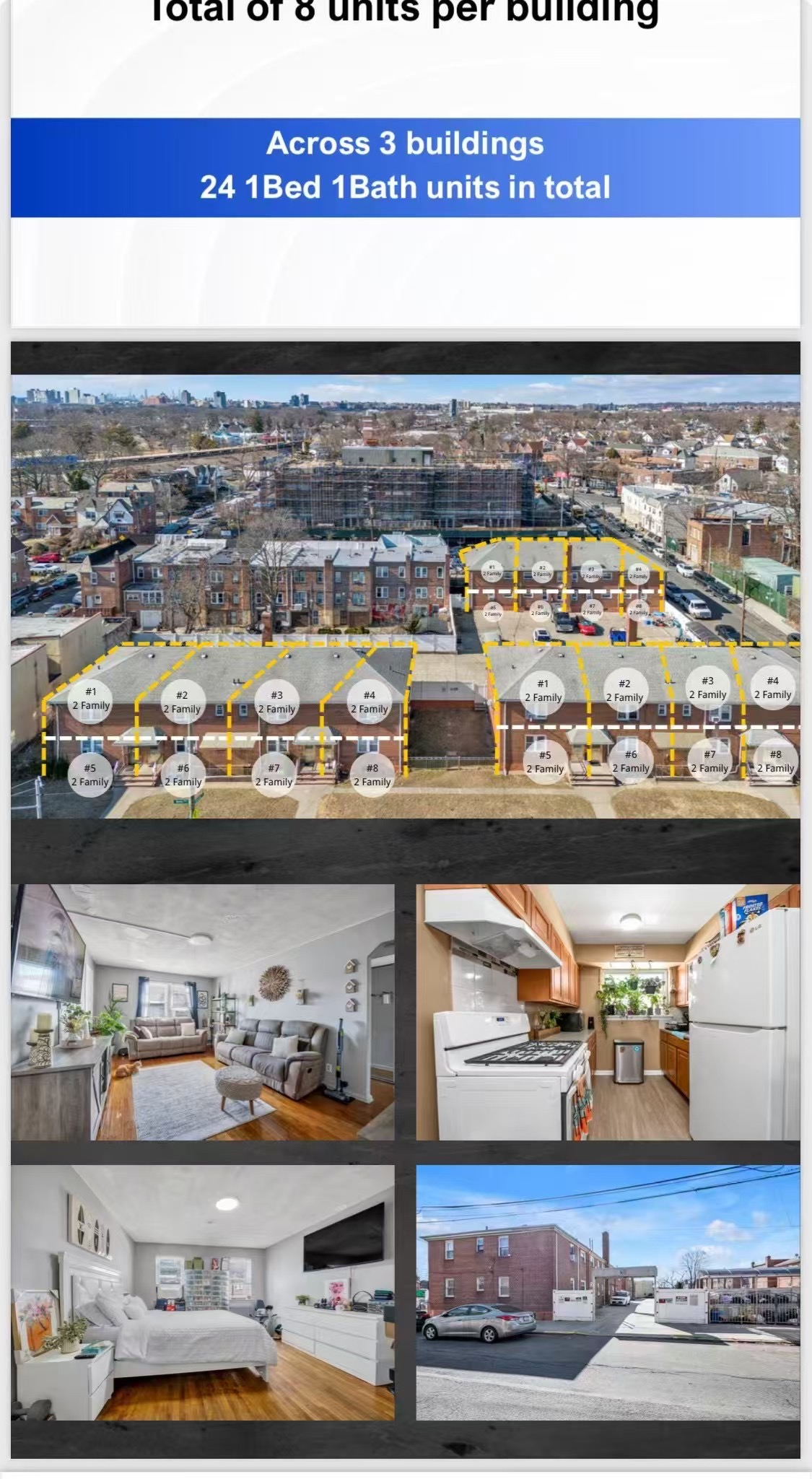 已经有多个投资者出offer, 赶紧约起来!独家代理:package sales 24套大一房大一厅(可以变成2房一厅),一共有12个2家庭的CO,好多玩法!还有一块地再盖4个2家庭。售价$428万,目前去掉开销净收入20万。详情联系代理经纪人李小姐347-885-8668 欢迎合作