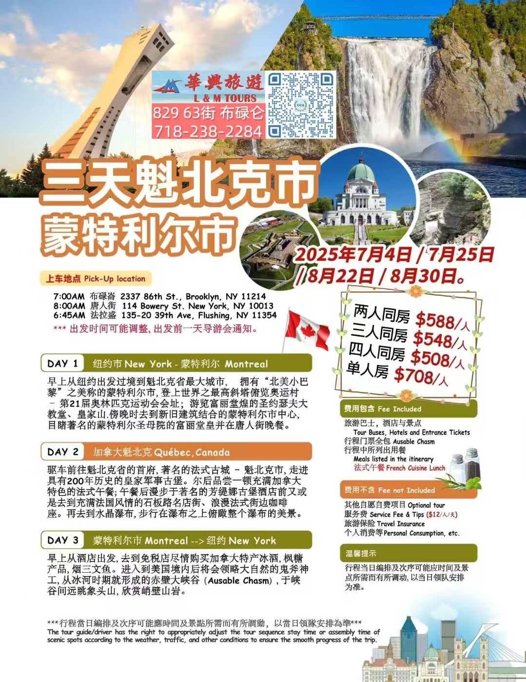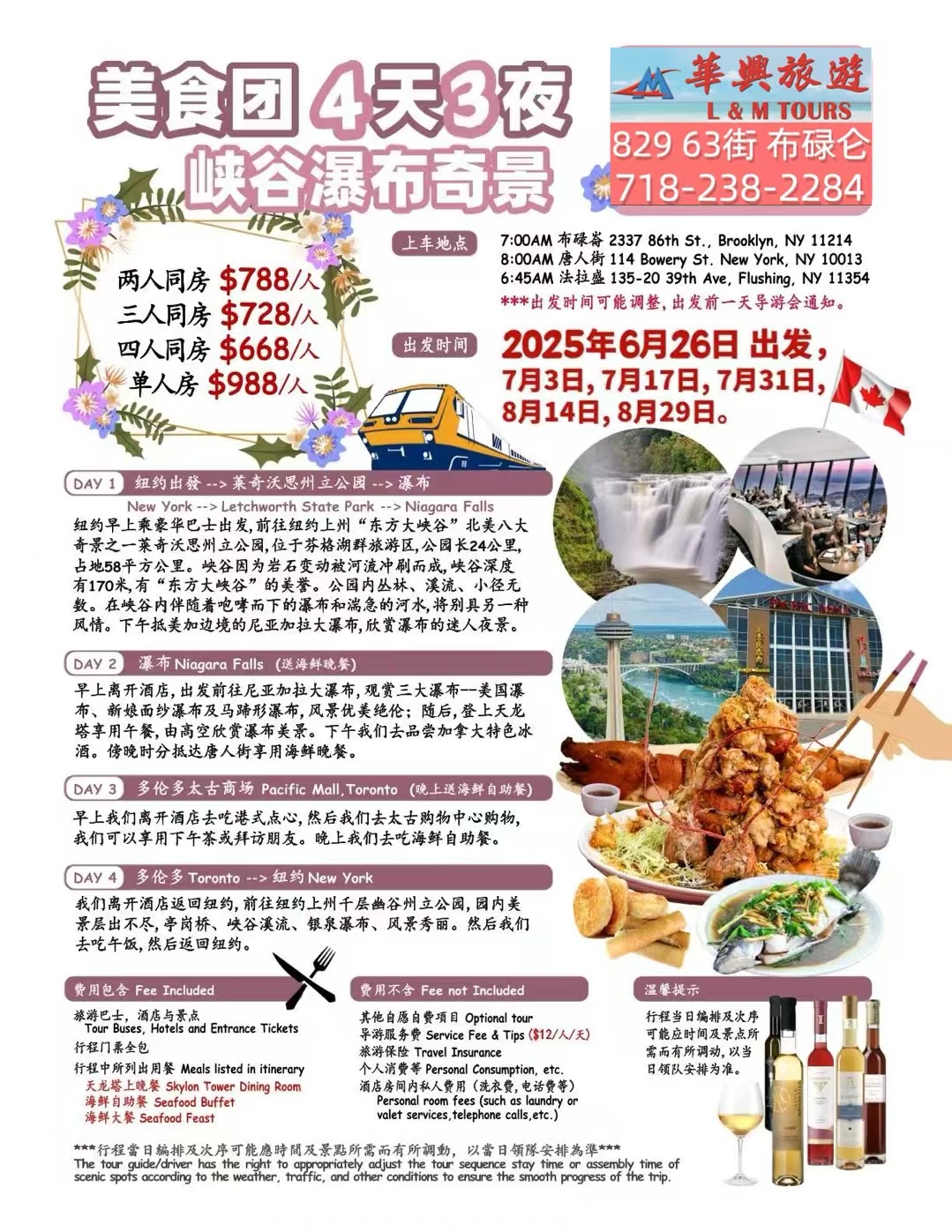 纽约华人网365-法拉盛旅游团每日出发 专业导游带团 中英文讲解 适合家庭及商务出行 纽约旅游攻略大全 华人旅游社精选路线 一日游多日游高性价比推荐 纽约旅游巴士团超值优惠 多语种服务 热门景点直达观光无忧 华人旅游公司纽约专业推荐 包团定制游 出境入境游均可承接一日游多日游高性价比推荐多样巴士团线路,法拉盛出发美东经典七日游 尼亚加拉瀑布+华盛顿DC深度体验 纽约出发波士顿名校探访团 哈佛MIT深度文化之旅适合亲子留学考察 纽约本地华人旅游公司推荐 专业中文服务 安排灵活 信誉保障 法拉盛旅行社哪家好?纽约华人最爱的一站式旅游服务平台推荐任您选择华兴旅遊 718-666-3918 829 63 Street Brooklyn, NY 11220