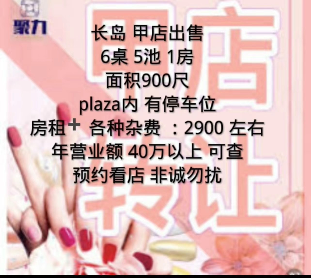 🌹长岛美甲店出售粉丝量近千售价$15.8万年營業額$40多萬 (周日休息) 現有員工六人,夏天擴招至八人面积900尺 租金&杂費$2900左右,费用极低 6手5脚1房 可加桌 完整排风系统 法拉盛车程30分钟 位于plaza内 有停车场周边居民平均家庭收入$20万 纯白区 客源稳定🌹 欢迎合作转发☎️718-2881821 Rebecca