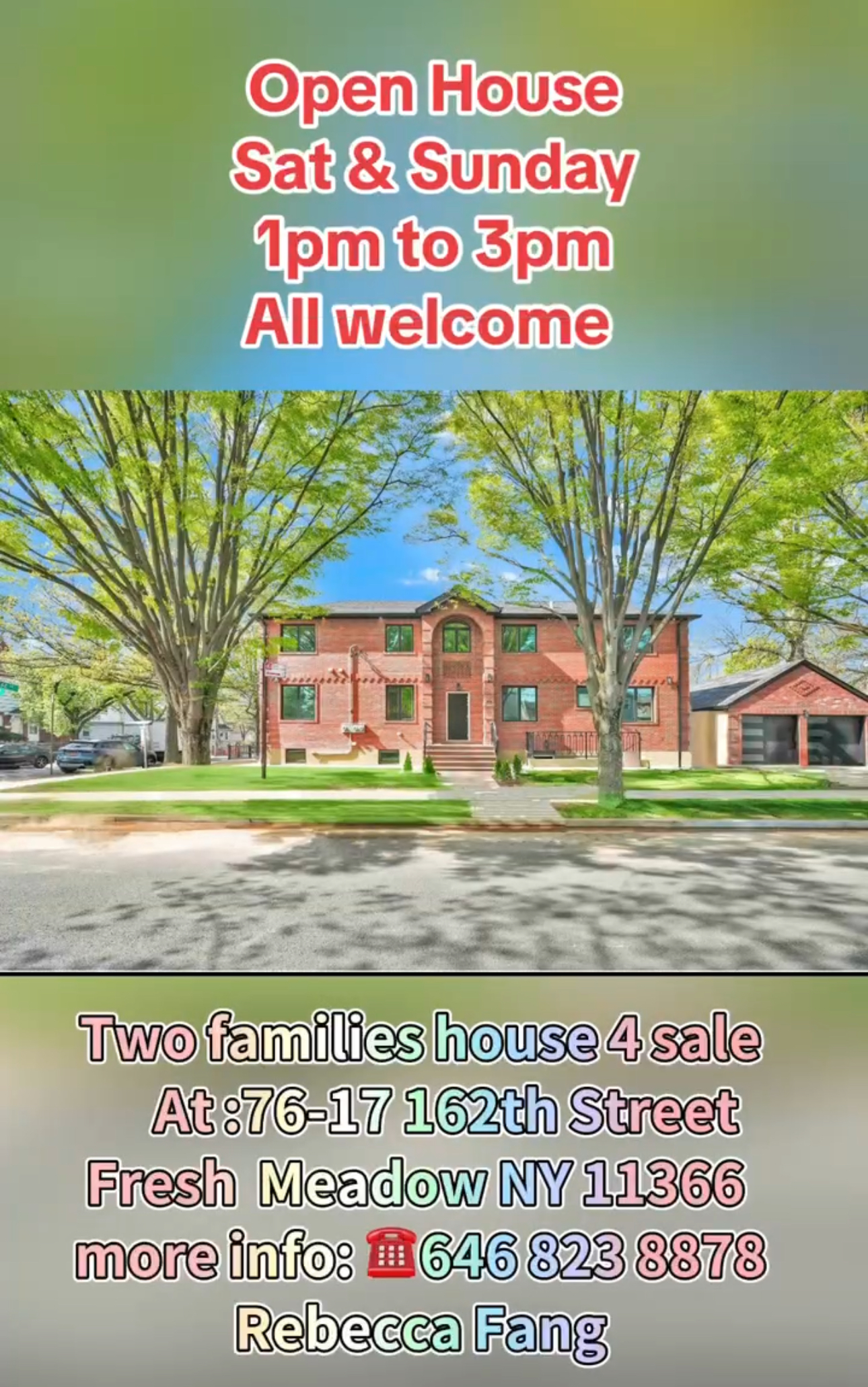 地址:76-17 162 st 新鲜草原Fresh Meadows NY 独家代理 新鲜草原独立街角两家庭豪宅🥃共六卧五浴加车库每个单位独力分门进出,完成地下室 地积:40X100 屋积 : 20X60 ,