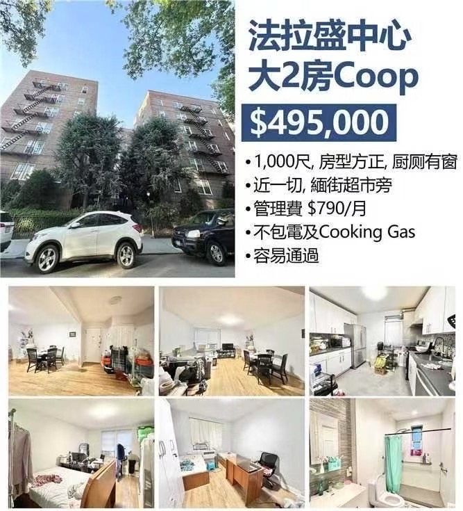 🔥法拉盛中心Coop大2房💰49.5万|约1,000尺🛋️厨厕有窗|格局方正🛒缅街旁|生活超方便