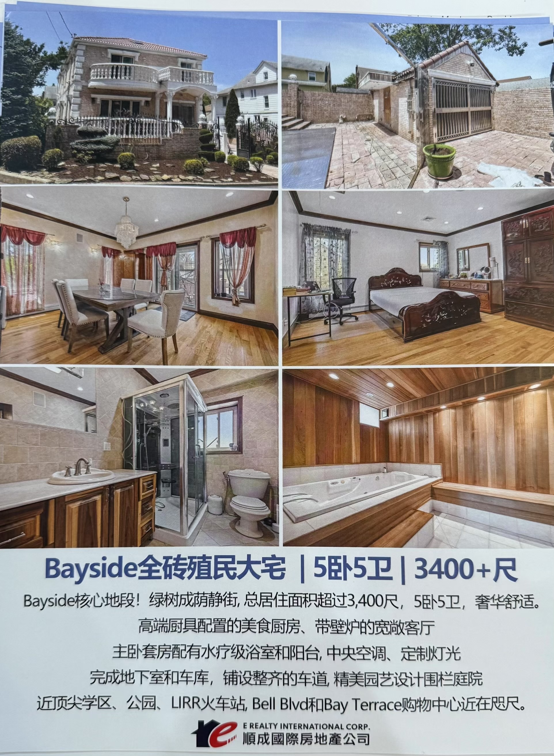 贝赛两家庭住宅出售Bayside全砖殖民大宅 | 5臣5卫 |3400+尺Bayside核心地段!绿树成荫静街,总居住面积超过3400尺,5臣卜5卫,奢华舒适。高端厨具配置的美食厨房、带壁炉的宽敞客厅主卧套房配有水疗级浴室和阳台,中央空调、定制少灯光完成地下室和车库,铺设整齐的车道,精美园艺设计围栏庭院近顶尖学区、公园、LIRR火车站,Bell Blvd和Bay Terrace购物中心近在咫尺917 293 8698