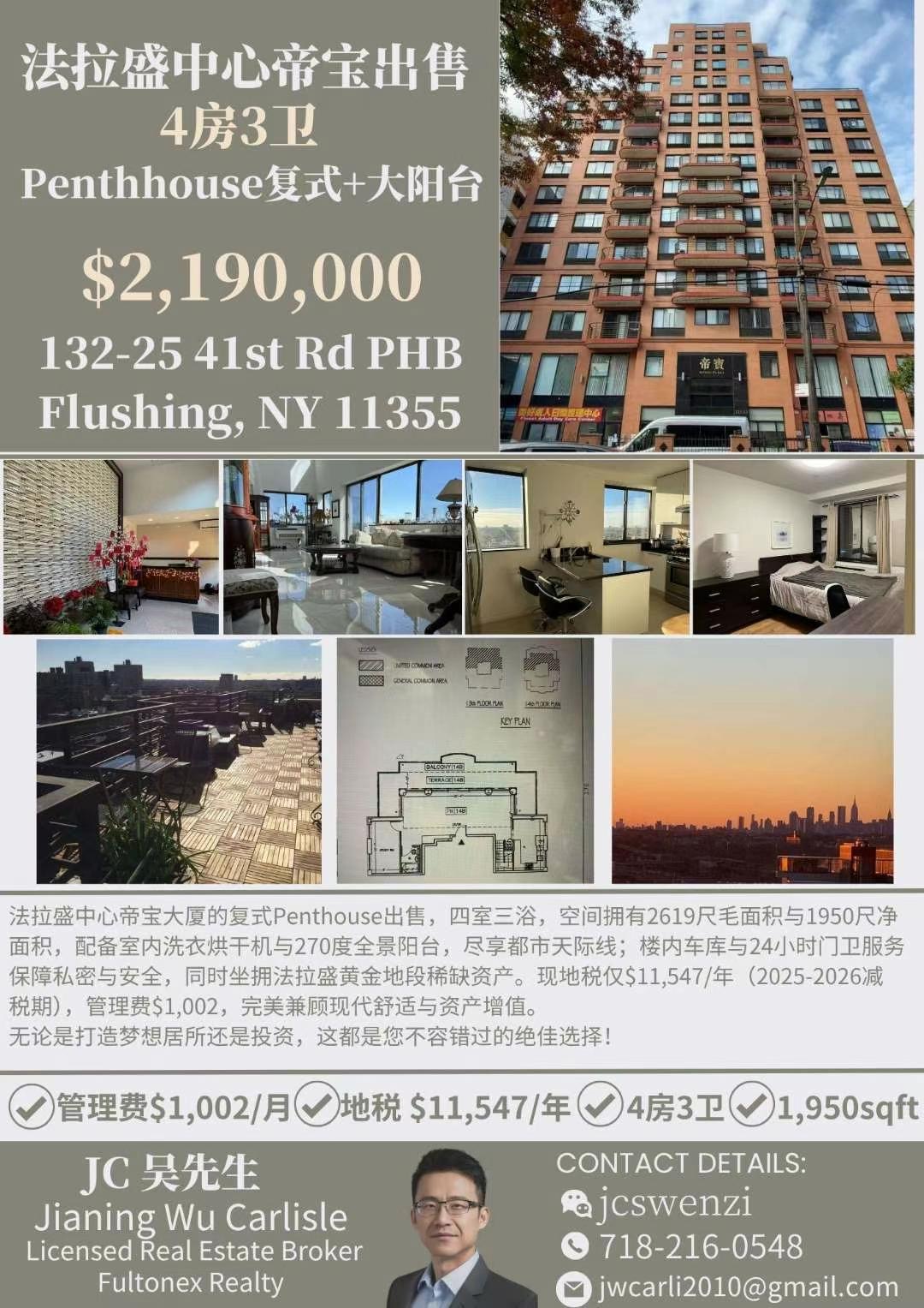 **刚刚上市。欢迎合作**法拉盛中心帝宝大厦独一无二顶楼复试4房3浴公寓出售。JC 718-216-0548.