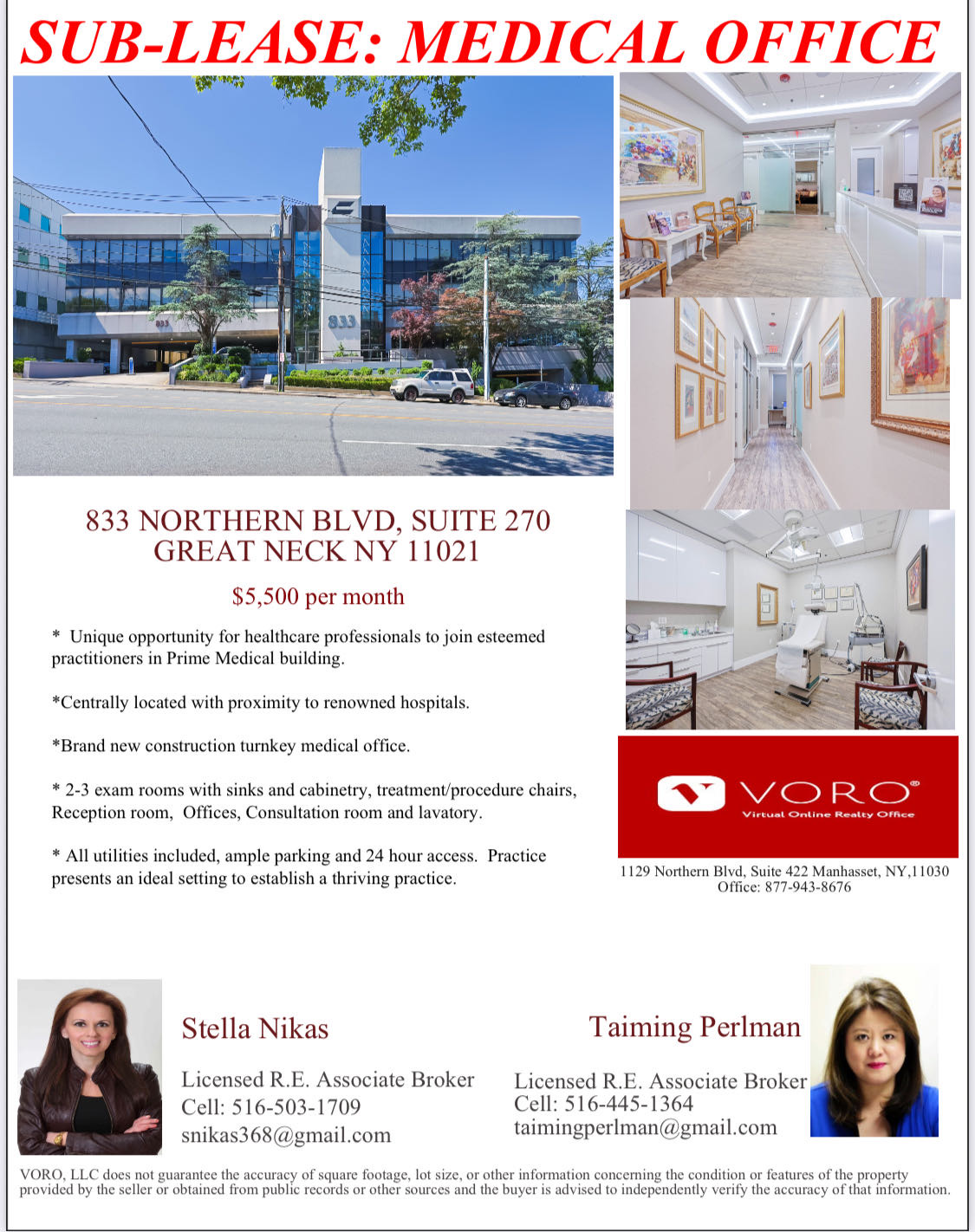 纽约北方大道大颈医疗办公室出租 中心地段 地址:833 NORTHERN BLVD, SUITE 270 GREAT NECK, NY 11021 租金:每月 $5,500