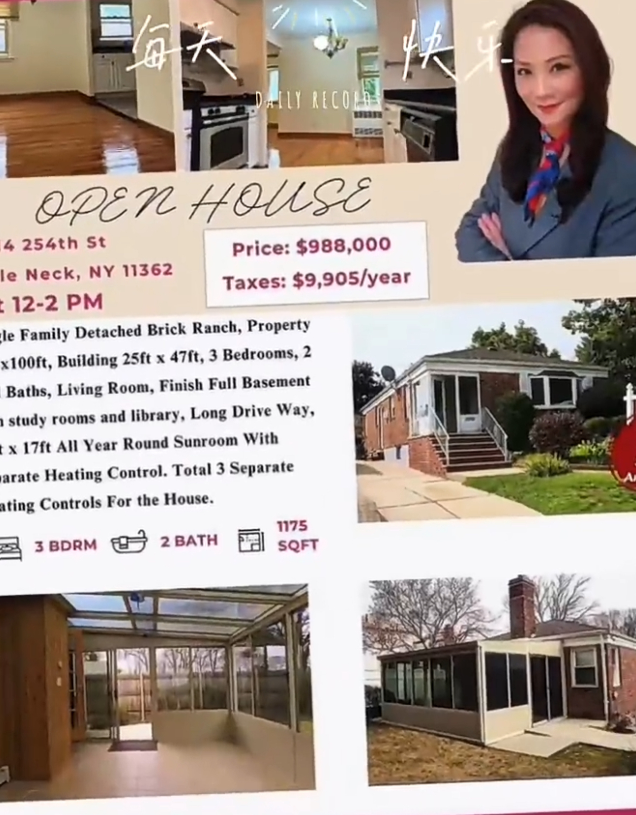 👉拎包入住.好房不等人👉已清空,隨時可以看欢迎预约👏好區小頸獨立一家庭砖砌牧场式房子40x100,建筑25x 47 。一楼3间卧室,全套浴室,大客厅.饭厅。地下室有2房1浴+客廳獨立岀口. 還有獨立车道可以停3部車。12x 17阳光房,带独立供暖控制。靠近所有公交车,LIE 495,SD 26、MS67、PS 221、卡多佐HS。距离购物中心、超市、餐厅、高尔夫球场、医疗中心、皇后区社区学院和皇后县农场博物馆仅几分钟路程。