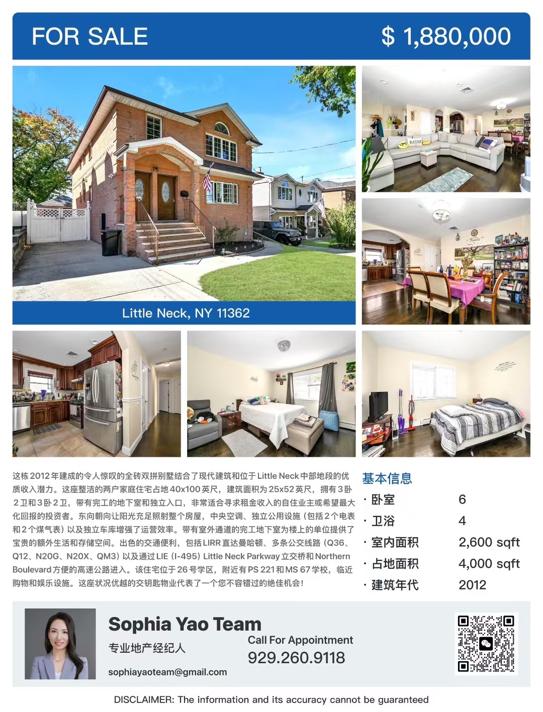 2家庭独栋小颈两家庭独栋出售 分层出租灵活 多代同堂优选小颈华人热门社区双家庭出售 环境清幽 居住舒适❤️Little Neck----2家庭独栋 ❤️