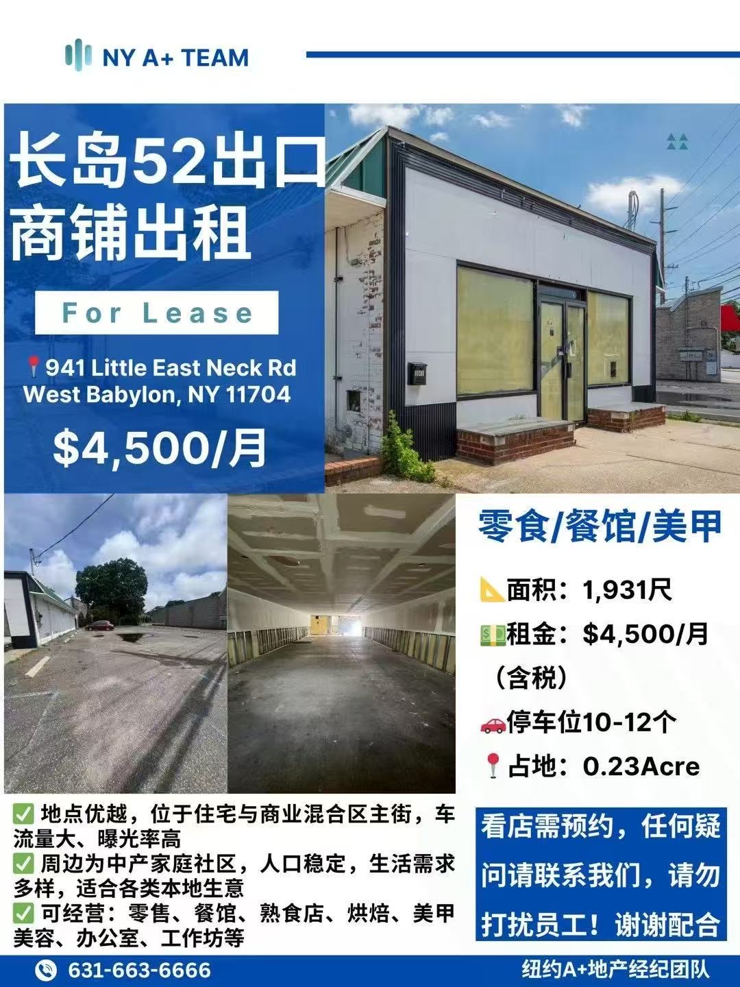 📍长岛West Babylon 独立商业楼出租|建筑面积约1931平方英尺,附10–12个专属停车位。屋主提供免租装修期,内部可自由设计格局。