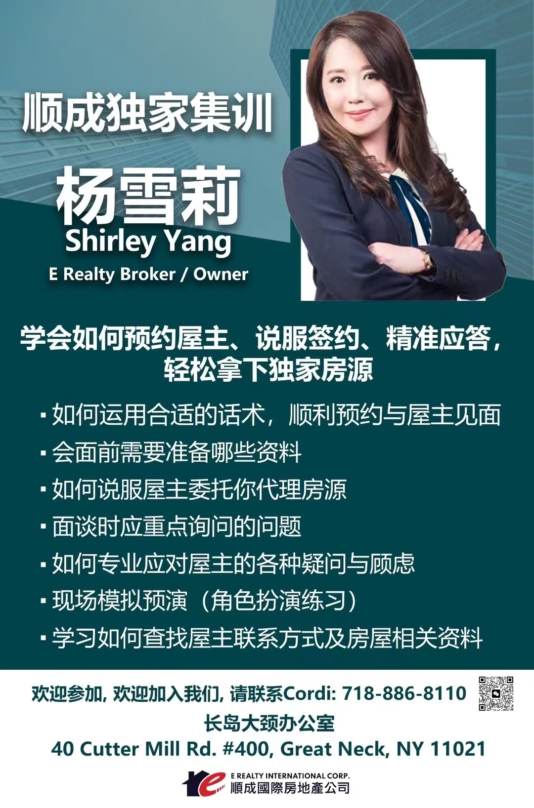 杨雪莉 Shirley Yang顺成地产 纽约顺成房地产法拉盛 顺成国际房地产 金牌华人经纪🔥【重磅消息】🔥几乎没有任何一家地产公司,能做到由老板亲自带你从零开始做卖方经纪!