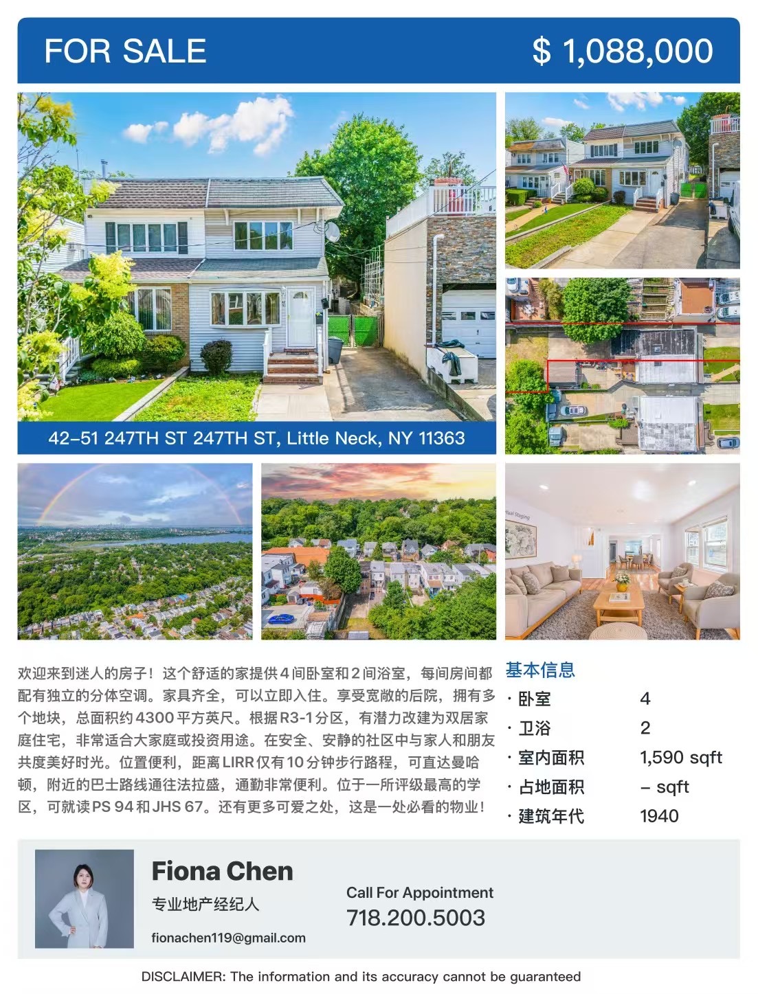 REMAX 1st Choice 新代理 皇后区房子出售Little Neck 小颈新上市单边一家庭住宅,4房2浴,适合三代同堂, 领包即可入住. 房子有延长过🌟实木地板、节能电器、独立车道,停车无忧,超大后院。🌟每个房间都有分体空调和衣柜满满细节,提高生活质量🌟位于皇后区东北部,邻近长岛,交通便利,靠近北方大道 公交车Q12去法拉盛。 步行10分钟LIRR火车 直达曼哈顿。👍学区优质,涵盖 PS94、JHS67,适合家庭居住。周边华人超市、餐馆及购物场所丰富,生活便利。占地面积4200 SF 是由2块地组成zoned R3-1轻松可改2家庭.42-51 247th st little neck NY 11363欢迎👏同行合作转发☎️718-200-5003陈
