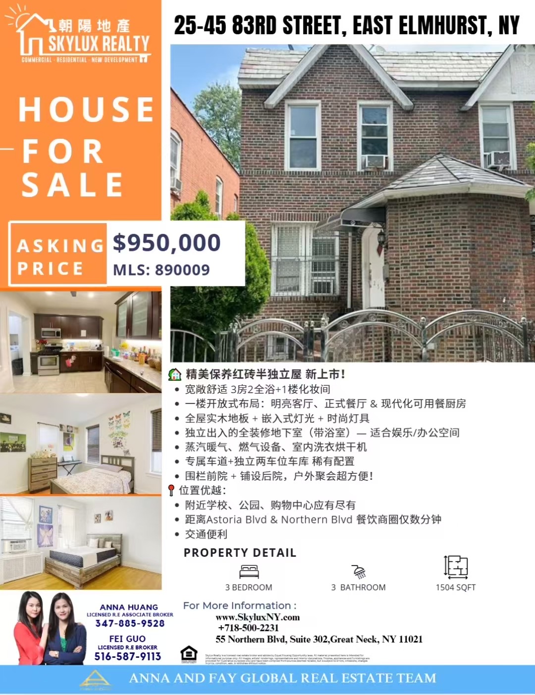 艾姆赫斯特房子出售最新上市!!皇后区优质住宅区 East Elmhurst 单边砖屋(通风采光极佳)95萬土地面积:20 x 100带独立车库,停车便利地税低,投资或自住首选!一楼:设有厨房、客厅、餐厅和一间浴室,空间宽敞,布局实用二楼3房1浴, 地下室:完成高地下室,可作家庭娱乐、办公或储物空间使用