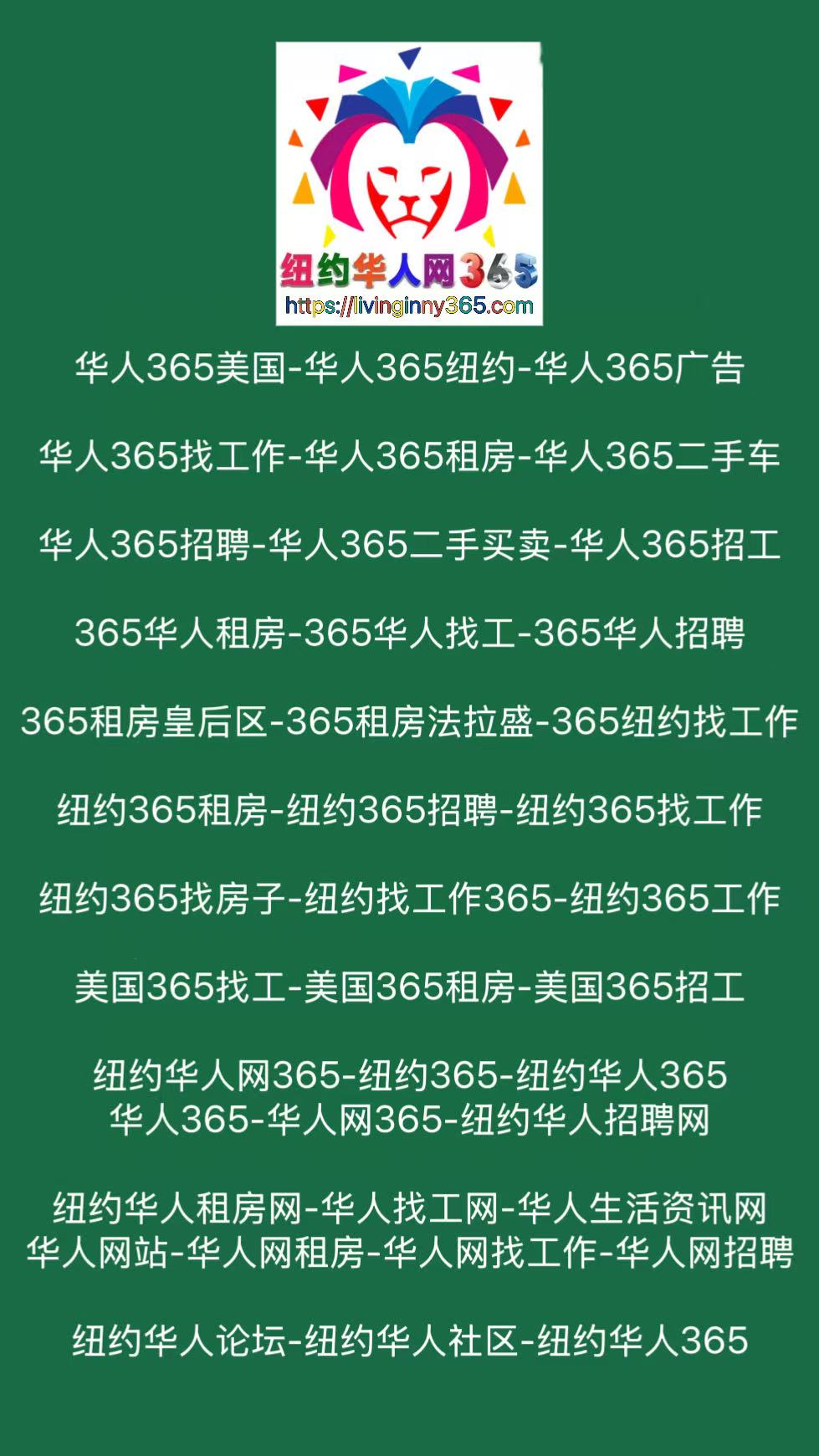 纽约华人网365:在纽约生活、找工作、租房的最强指南。纽约华人网365为华人提供最全招聘信息、纽约找工作、租房信息、二手买卖、分类广告等服务。覆盖法拉盛、皇后区、布鲁克林,打造最专业的华人生活平台。365华人租房平台提供法拉盛、皇后区、布鲁克林等地真实房源,更新快、房东直租、租房无忧。纽约华人租房网每日上新,助你轻松安家。