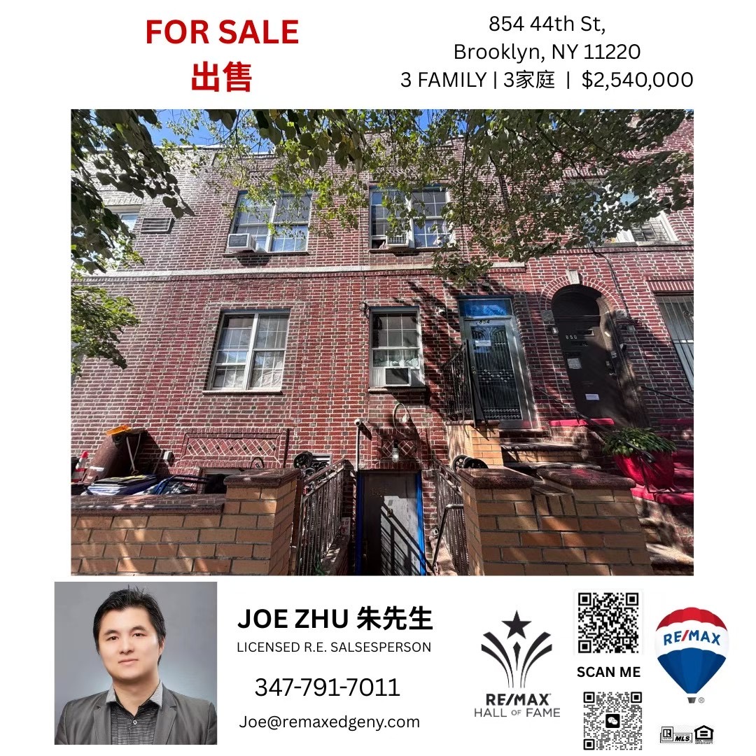 布鲁克林8大道超大三家庭砖房出售 新上市 • 8大道罕见大三家庭 •钢筋水泥结构, 近50万装修📍**854 44th St, Brooklyn NY**