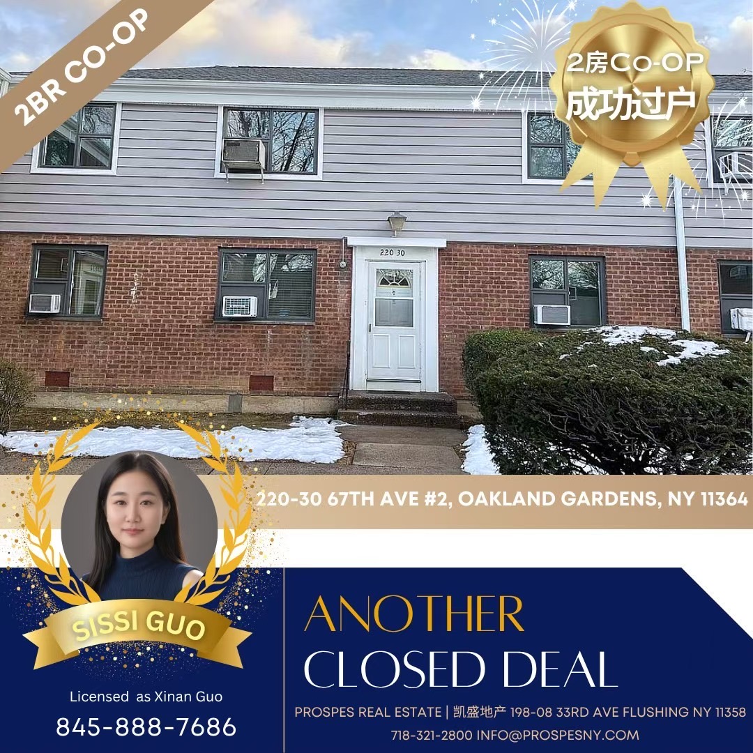 凯盛地产经纪Sissi Guo成功过户!✨💪🏼💪🏼感谢我们的买家选择凯盛经纪Sissi帮助他找到位于Oakland Gardens 2 bedroom Coop, Sissi认真负责,专业可靠,顺利过户!凯盛地产的经纪专业强服务佳!买家与卖家的满意是我们最高的追求,如果您有任何地产自住投资的需求,欢迎与我们联络!我们也诚邀更多地产精英加入
