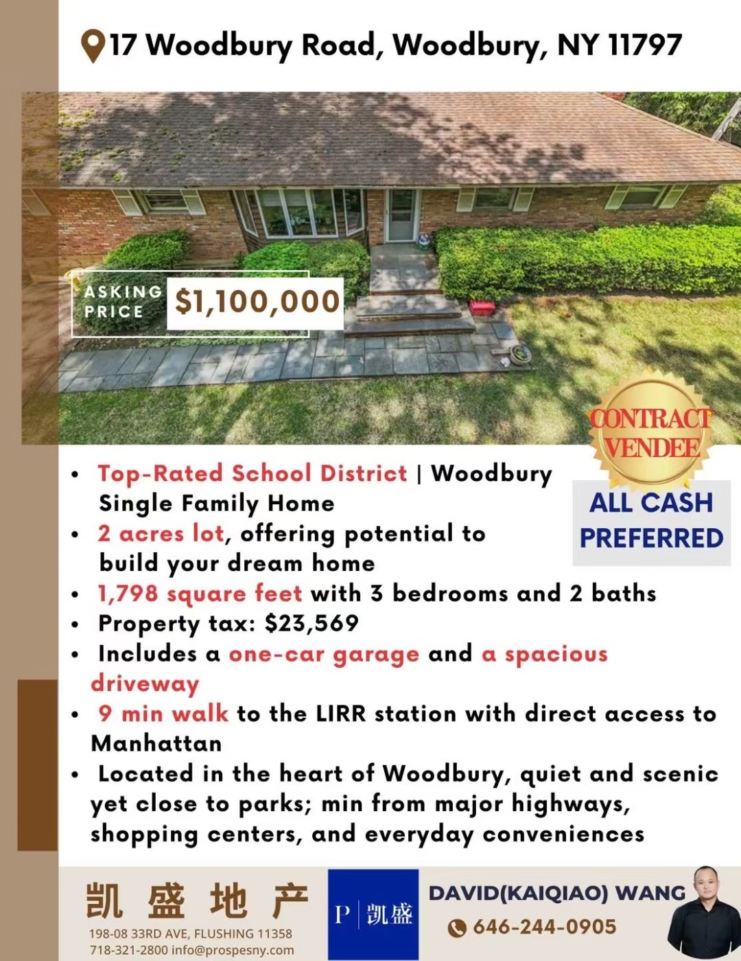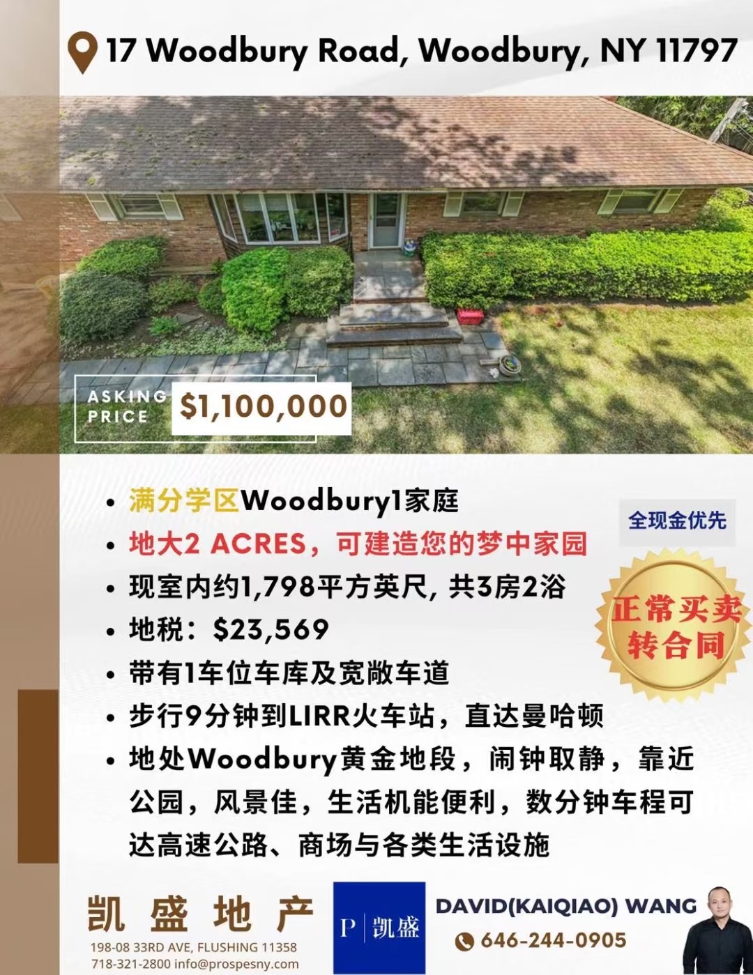 💙凯盛地产💙独家代理🔥Woodbury 长岛满分学区转合同🔥 全现金优先,正常买卖, 机会难得