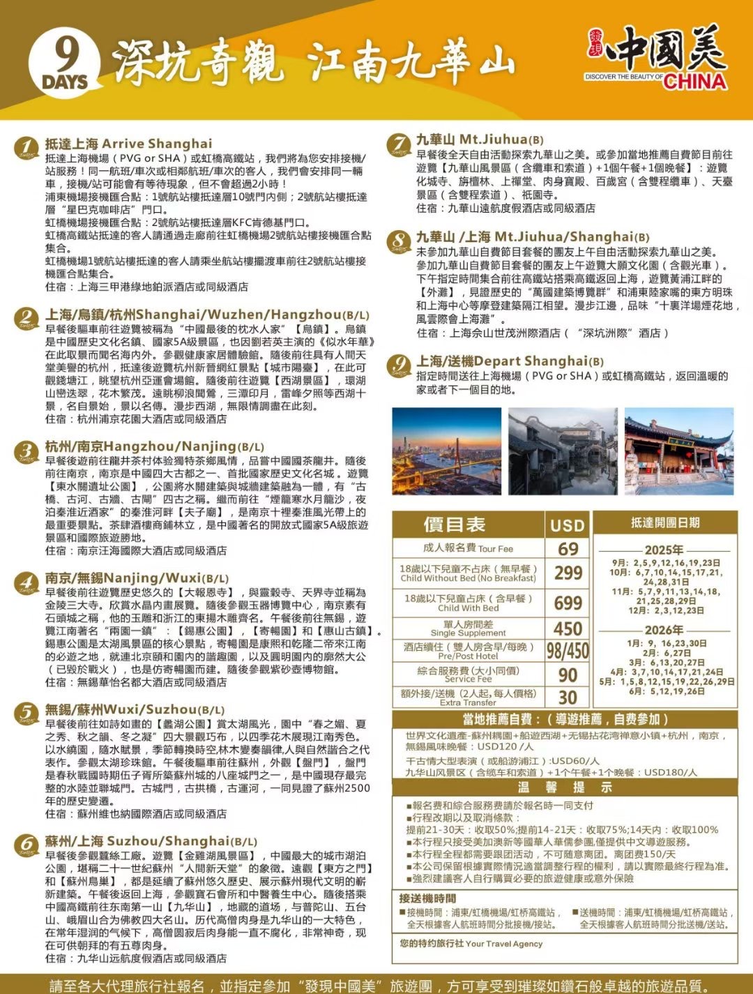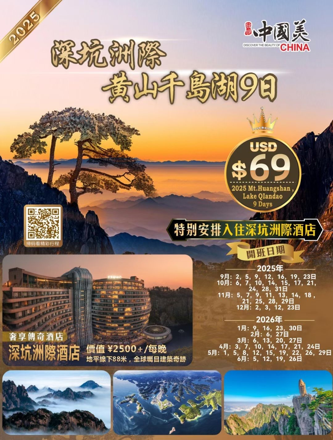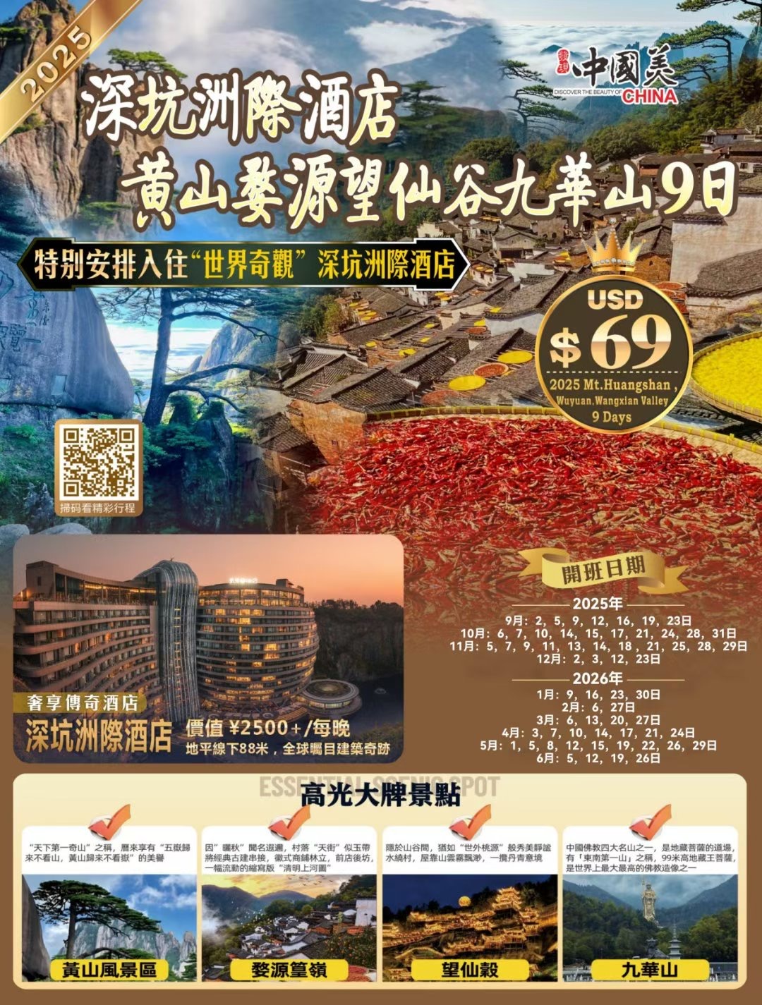 中国美江南线路秋季炸裂!新增海量开班日期轰炸上市!💥💥中国美江南2026年日期领先上市!💥💥市场顶配品质,开班日期王炸!惊爆价$0起秒杀全宇宙‼️ 横扫江南顶奢套餐,打卡顶流仙境!铂金江南:五大名城联动,人生大满足!安徽黄山:登顶奇松云海之巅!☁️宁波普陀山:海天佛国,画中朝圣!🚤 江西婺源:篁岭醉美晒秋,一眼万年!🌾 江西望仙谷:悬崖仙侠,直通秘境!🏞 安徽九华山:佛国圣境,心莲盛放!🪷 [👑 殿堂级独霸]:传奇InterContinental深坑洲际!🏨 壕占¥2500+/晚 | 魔幻地心88米!全球建筑奇迹霸屏朋友圈!🌍✨🔥 手慢无!提前锁定2026王炸席位