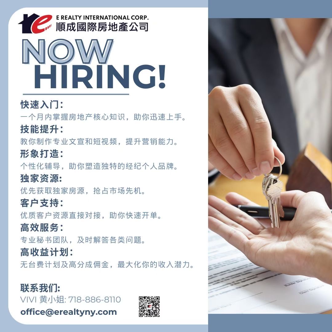 顺成地产招募活动 👥E Realty Int'l Corp 顺成国际房地产🌟诚聘地产经纪🌟顺成国际房地产公司在2024年取得卓越业绩!在全皇后区和长岛的房地产公司中,顺成的总成交金额位居第一。我们顺成已经成功帮助上千位经纪打开事业生涯, 我们有信心让你也成为TOP AGENT! 加入顺成,携手并进,乘风破浪,共创辉煌!