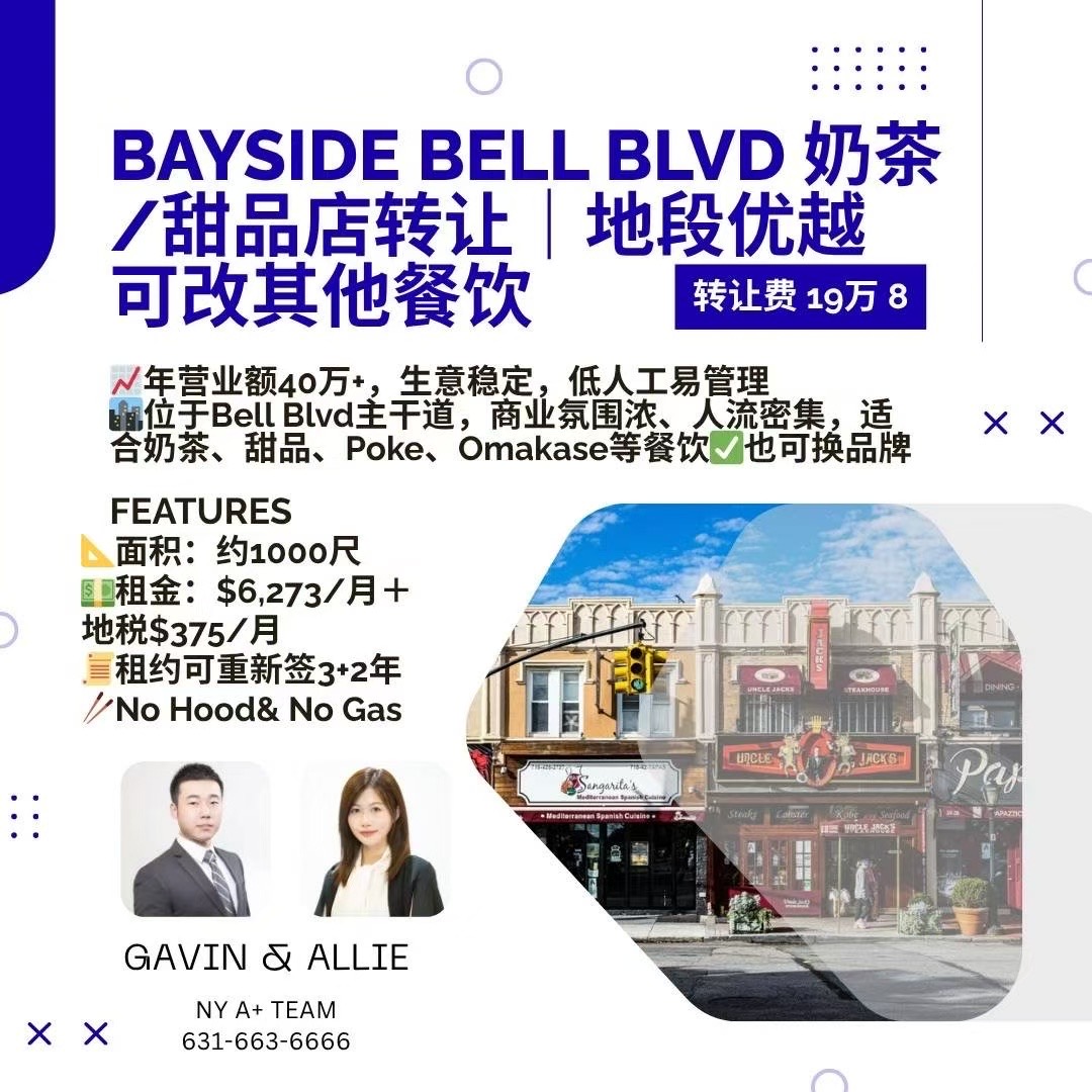 纽约生意转让📍Bayside Bell Blvd 奶茶/甜品店转让|地段优越 可改餐饮📐面积:约1000尺💰转让费:$198,000