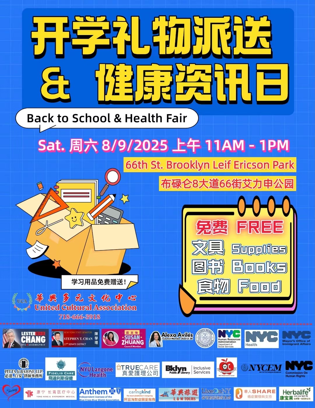 开学礼物派送&健康资讯日免费文具,食物和图书周六 8/9/2025上午 11AM - 1PM66th St. Brooklyn Leif Ericson Park