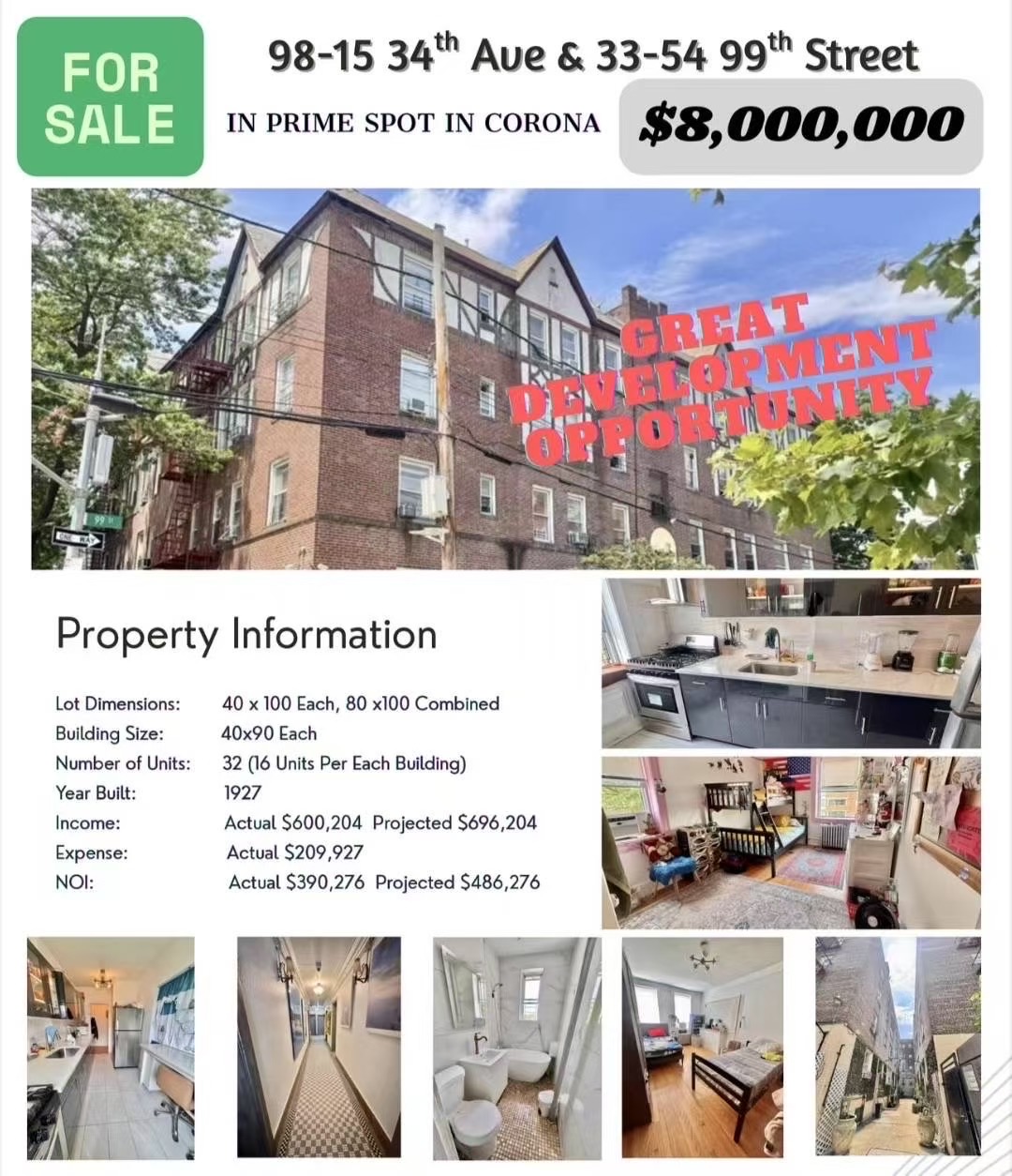 下调价格$780万(欢迎合作转发)Corona 可乐娜日益增长成为人流密集,商机勃勃的社区。 两栋大型建筑楼共32单元位于黄金地段,近7号地铁站,学校,公园,及商业街北方大道多部公交车路线[强]。 每栋建筑每层40x90, 地80x100, 室内状况良好[强],其中16单元全新装修过,屋顶3年新。21单元是一房一厅,11单元为二房一厅。现回报率为5%Cap. 预计可达至少6%Cap[强]. 万(卖家付佣金)917 293 8698