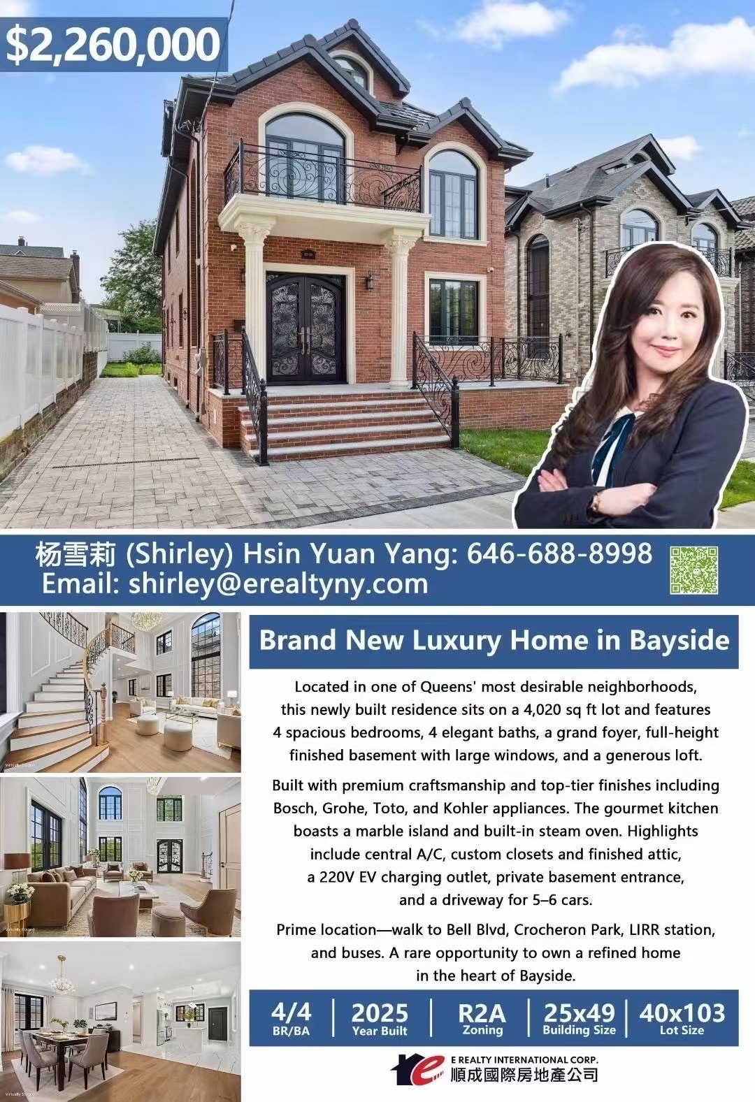房屋大小:25尺 x 49 尺体验无与伦比的现代奢华生活,这栋全新落成的豪宅坐落于皇后区备受青睐的 Bayside 高尚社区,占地约 4020 平方英尺。室内设计典雅大气,设有 4 间宽敞卧室、4 间精致浴室、高頂全装修地下室有4 大天井大窗,光綫與1 樓無異,以及一个宽敞的阁楼。全屋建造精细、用料讲究,配备中央空调、气派的挑高玄关大堂,以及 Bosch、Grohe、Toto、Kohler 等顶级欧洲品牌厨卫电器。奢华厨房配有大理石中岛、蒸烤箱等专业设备,整体设计兼具格调与舒适。