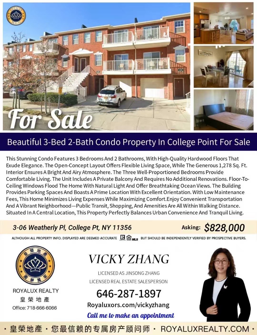【新上市】皇荣地产独家代理好房源🎖️近法拉盛大学点漂亮3房2浴康斗出售 | 售价$828,000大学点漂亮的Condo房产,拥有3个房间,2个浴室, 房内采用优质实木地板,体现高雅品味,开放式户型设计,使空间更加灵活。室内空间大1278尺,布局通透,三房设置正规,居住更加舒适。房屋附带阳台,而无需进行额外装修,超大落地窗提供充足采光,同时可以享受壮丽的海景。大楼配备停车位,位置优越,朝向良好。管理费低,为居家生活减少负担。便捷的交通网络和强大的生活机能,步行即可到达各类公交站点,购物与出行都极为方便。房产位于中心地段,完美平衡了繁华生活与宁静居家的理想状态。欢迎合作与转发🌹📍地址:3-06 Weatherly Pl, College Pt, NY 11356📲约看请联系负责经纪: