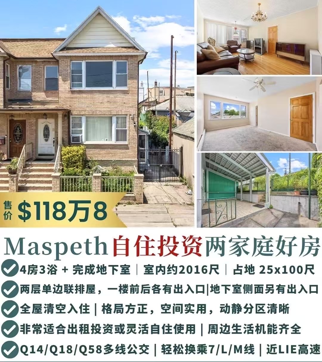 🔥Maspeth皇后区房子出售自住投资两家庭好房🔥🛏️4房3浴 | 建筑面积2016尺 | 占地 25x 100尺🚪两层单边联排屋,一楼前后各有出入口🏠地下室已装修完成,带独立出入口,可灵活出租