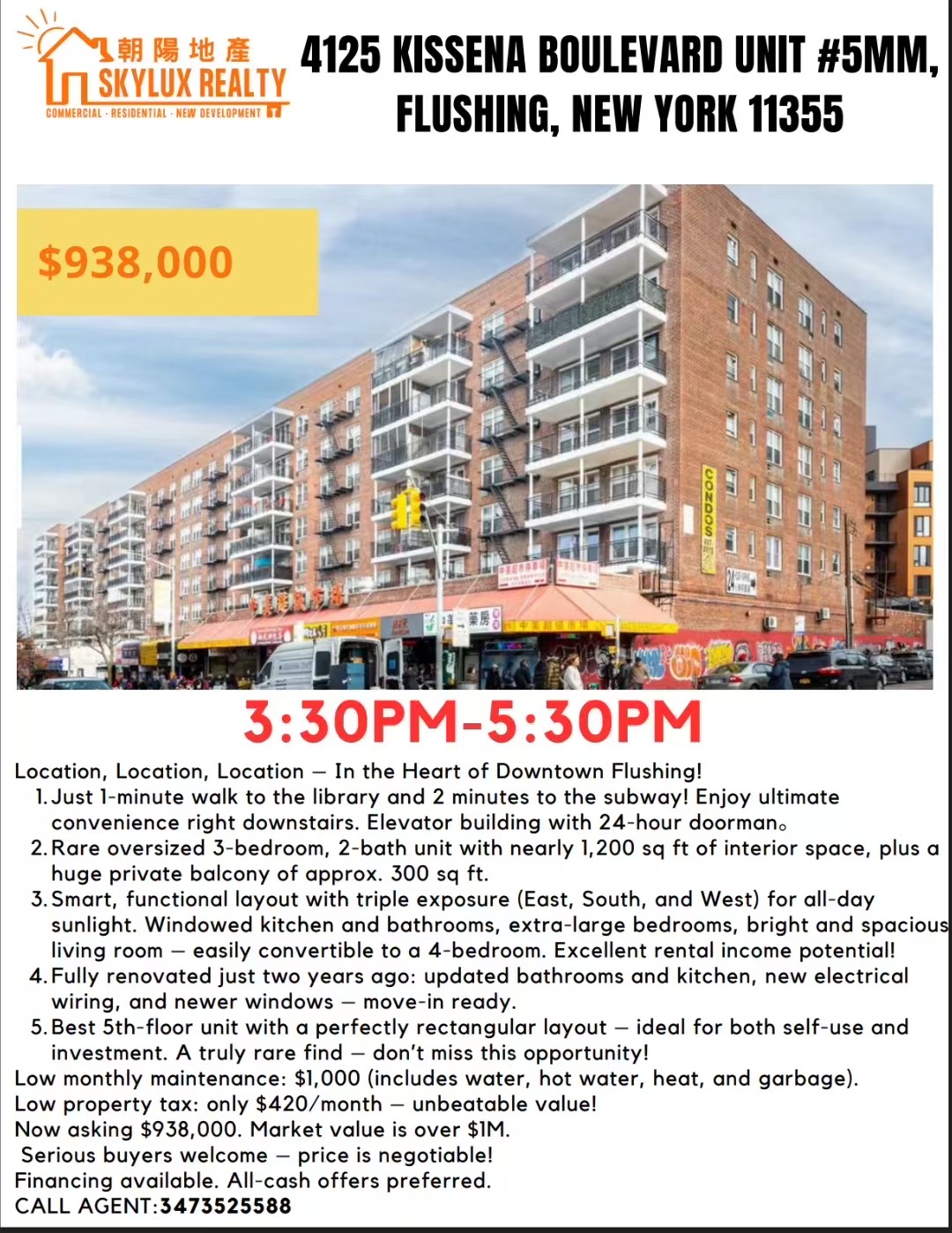 法拉盛中心的中心,百利大厦1、走路一分钟图书馆,2分钟地铁,下楼就享受最方便的生活,电梯楼,24小时门卫,无车族首选2、罕见大户型3房2浴,室内使用面积近1200尺,超大阳台近300尺3、户型方正,东、南、西朝向,全天采光,厨房、厕所都有窗,超大卧室 ,宽敞明亮大厅,可以隔四房,投资好收益!4、两年前屋主厕所、厨房重新装修,电线新换,窗户更新,可拎包入住5、最好5楼层,户型方正,堪称完美,投资自住都是最佳选择,难遇的好房源,千万别错过低管理费1000/月,包水、热水,暖气、煤气、垃圾等,电不包。低地税420/月,超高性价比 现只要93.8万,市值100+,诚意买家欢迎出价,可谈 可以贷款,全现金优先 欢迎👏所有人合作:3473525588