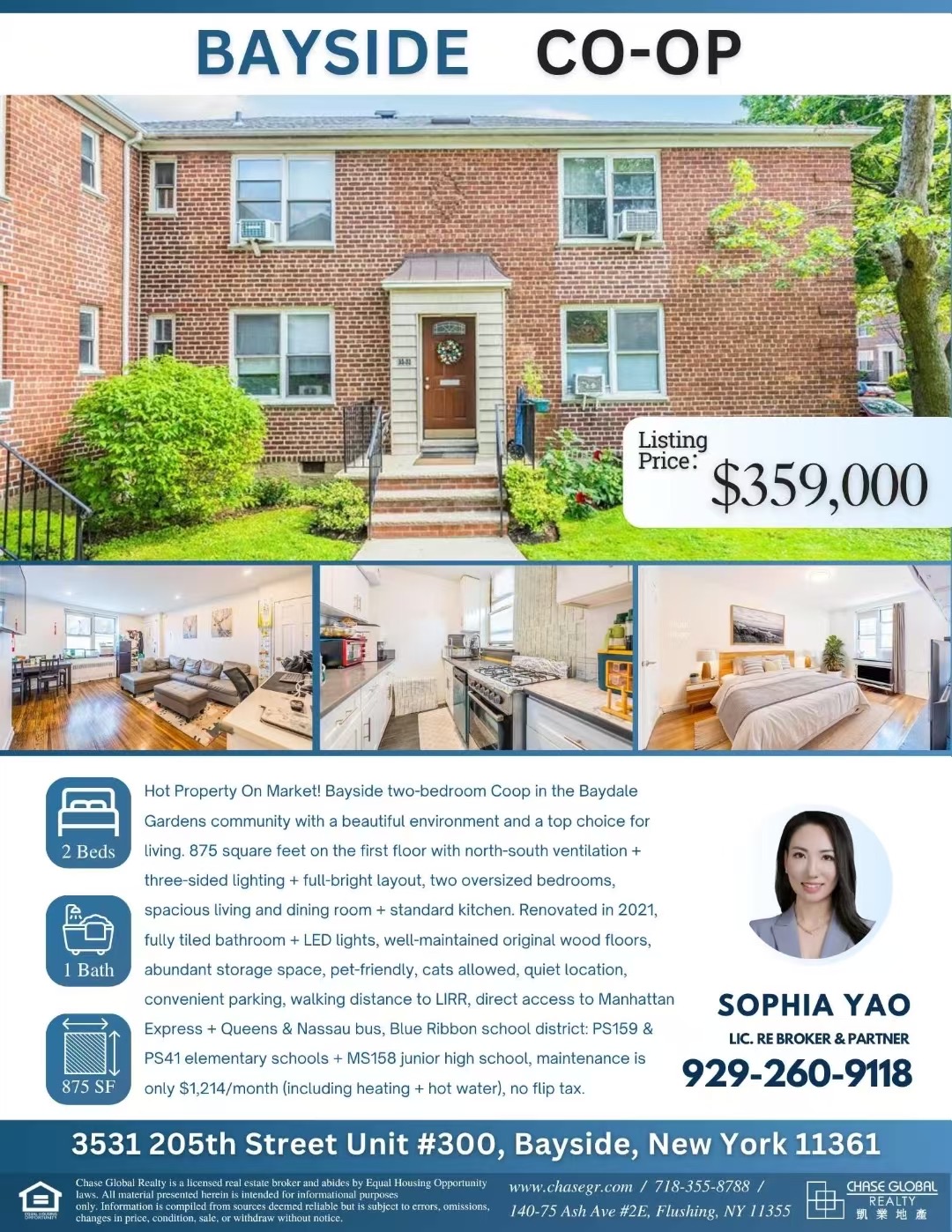🏡 Bayside贝赛两房Coop火热上市,仅售 $35.9万!📍地址:35-31 205 Street Unit 300, Bayside, NY 11360