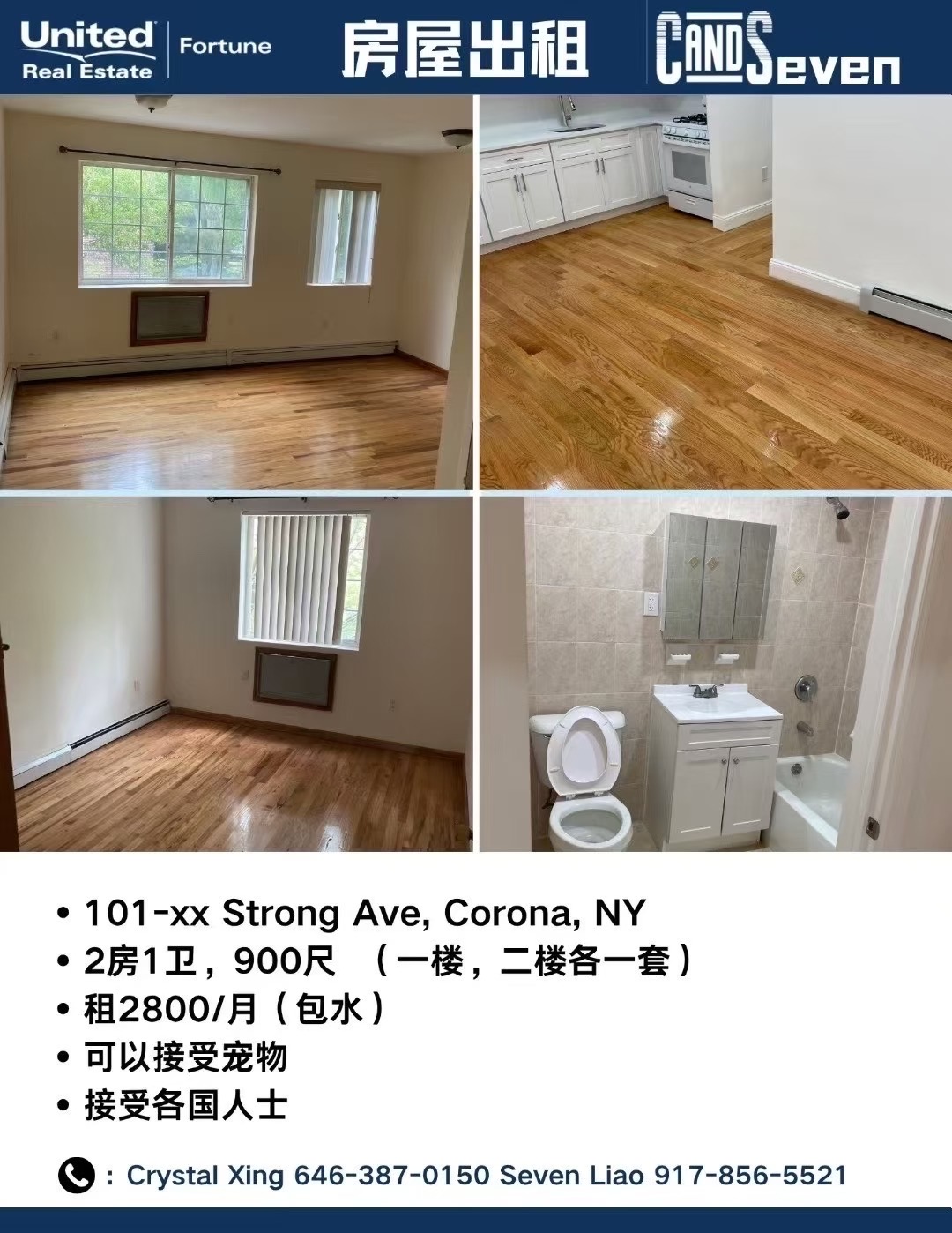 可乐娜两房一厅出租101-xx Strong Ave, Corona, NY一楼,二楼各一套两房一卫 900sf$2800/月 (包水)近公园,交通方便 可接受宠物接受各国租客
