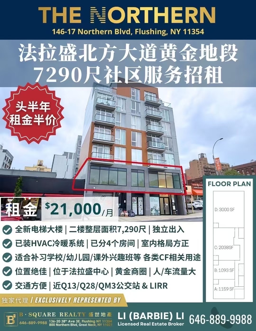 纽约法拉盛北方大道2楼7290尺招租头半年半价!欢迎合作!有钥匙