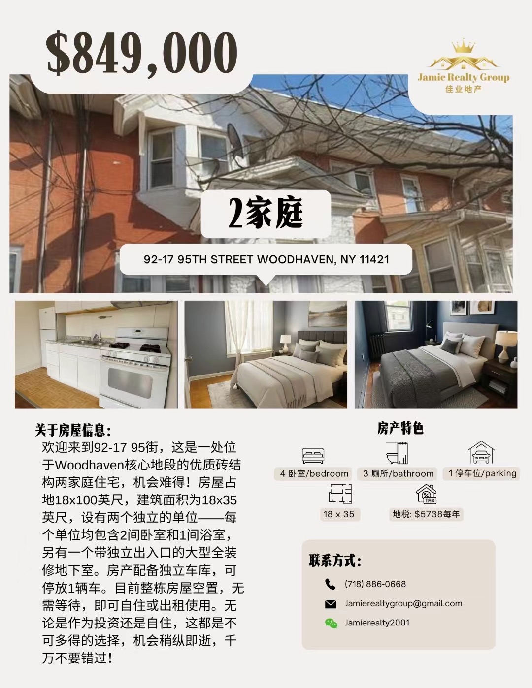 皇后区双家庭出售 居住分层 租售灵活 自由组合皇后区二家庭出售 房东直售 地段稀缺 学区优质