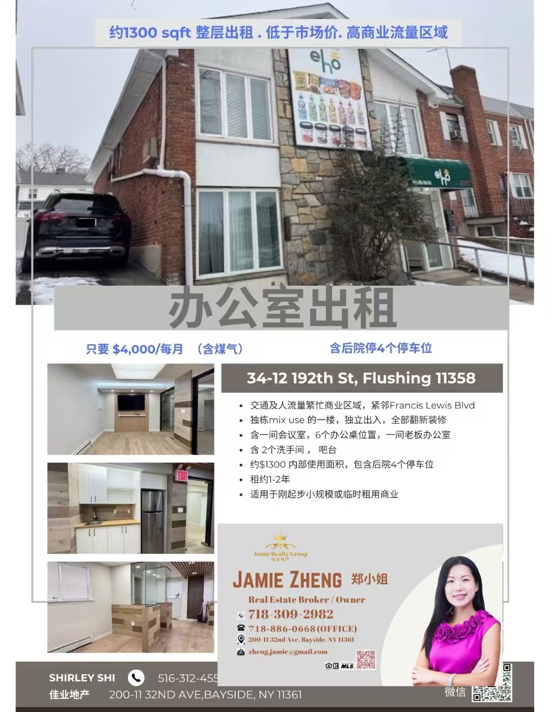 🔥🔥法拉盛 贝赛超值办公室出租 💰只要$4,000/每月地址 34-12 192nd St Flushing NY 11358约1300 sqft 整层出租.低于市场价。.👉🏻交通及人流量繁忙商业区域,紧邻Francis Lewis Blvd
