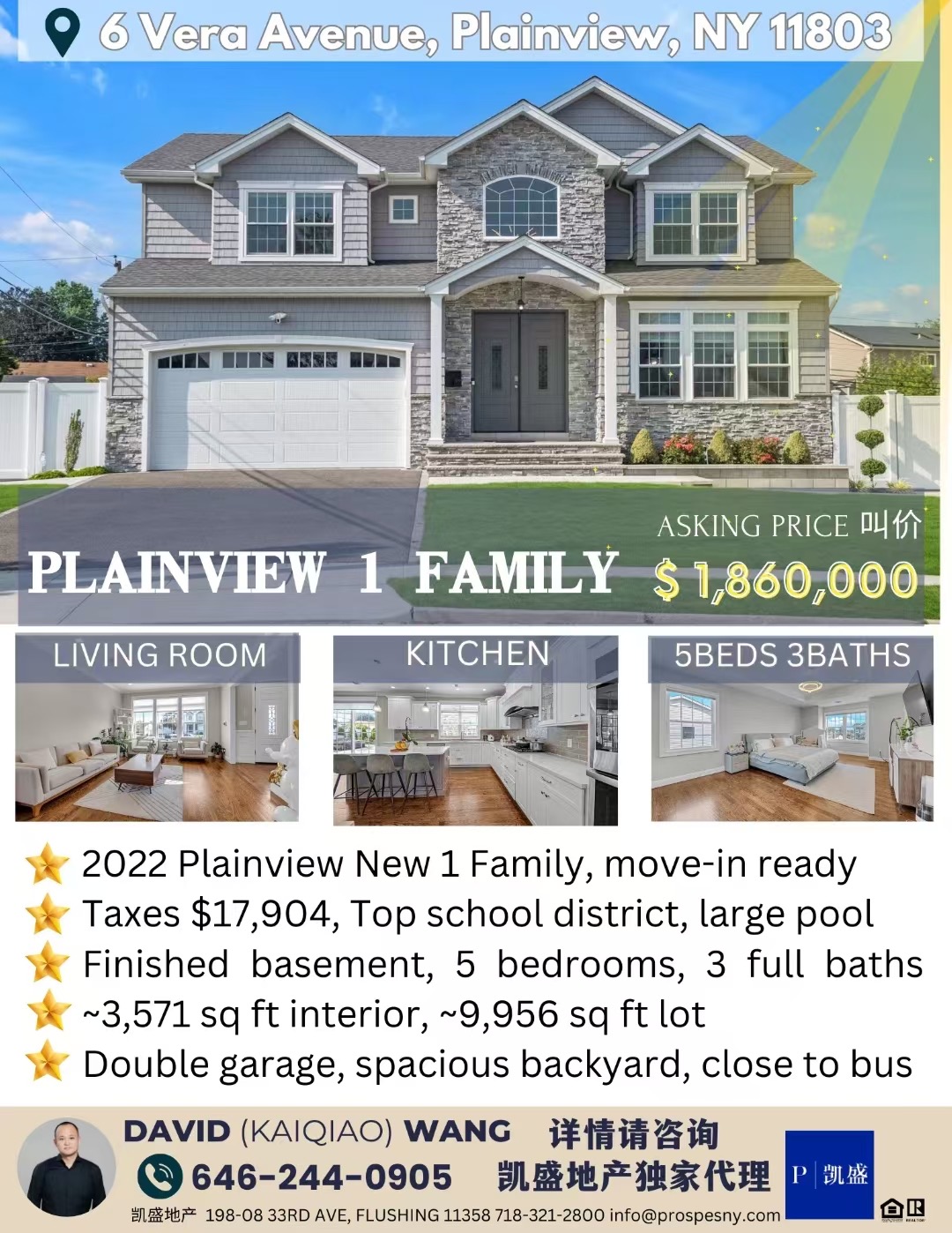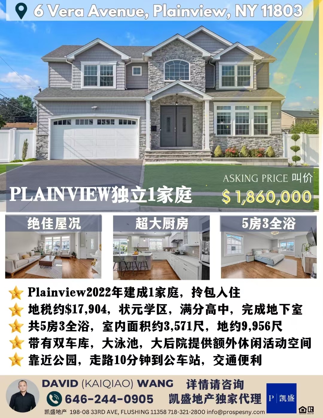 💥长岛新上市|凯盛地产💙独家代理💙🏡✨ Plainview 2022年建成豪华1家庭 🎓状元学区 · 满分高中📍 6 Vera Avenue, Plainview, NY 11803💲 售价:$1,860,000💼 拎包入住 | 钻石屋况 | 室内面积约3,571尺📏 地约9,956尺 | 室内面积约3,571尺🏠5房3全浴 | 完成地下室🚗 双车库 + 宽敞车道🏊♂️ 超大泳池 + 大后院 🌳 — 休闲娱乐的完美空间🏫 顶级学区,孩子未来的黄金起点