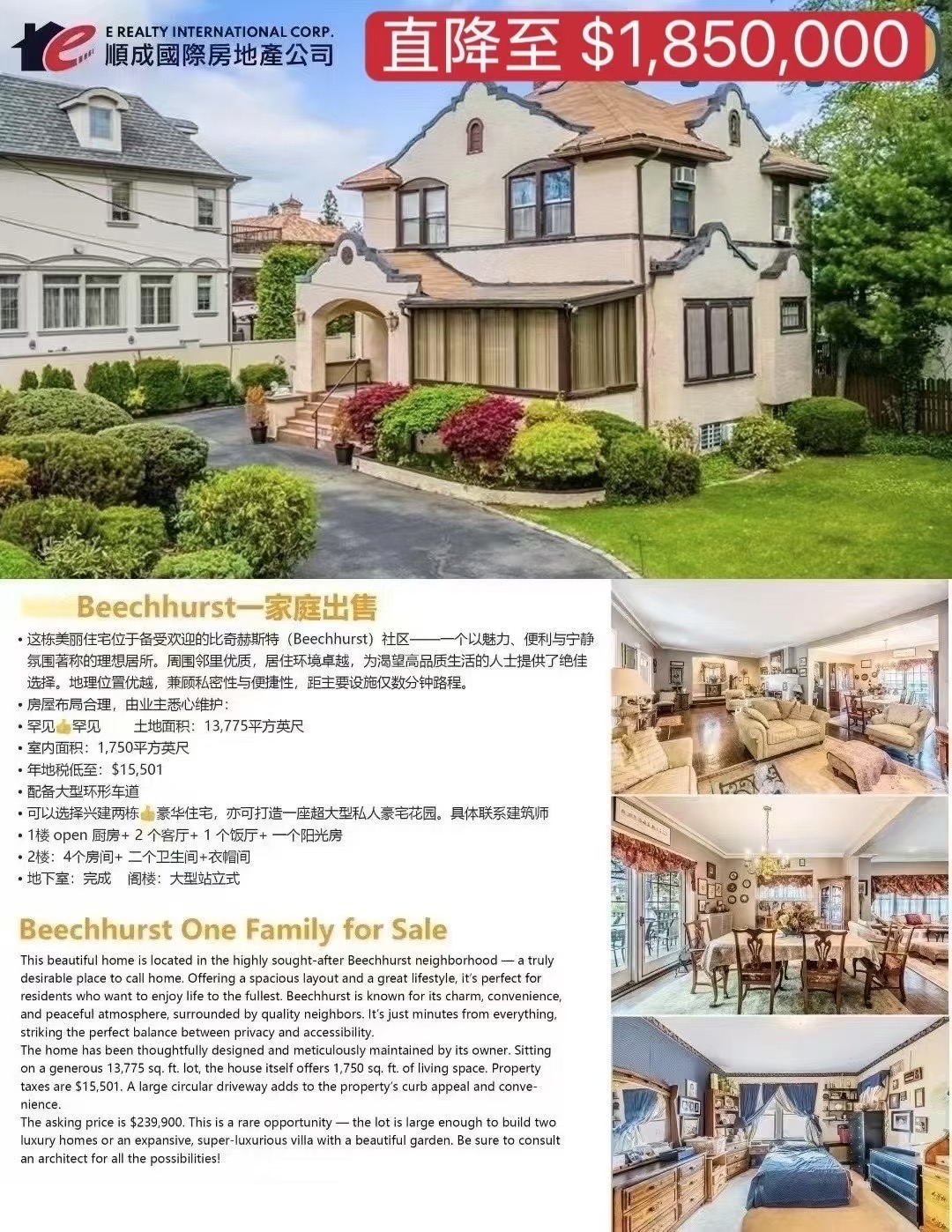 白石镇一家庭出售 近法拉盛 精装修 带车库后院 降至$1,850,000了买地买房建最牛B的房子🏡 白石镇核心地段,镇中之宝强劲登场!皇后区Beechhurst!🌟 与 白石镇中Malba 齐名的黄金社区 —— Beechhurst📐 超稀有大地 13,500 sqft✅ 可建约 4,900 sqft 超大豪宅!👍有survey打造专属奢华梦想别墅!•私人专属转弯车道,尊贵出行体验•四周花香环绕,环境优雅宜人现有房屋:1️⃣楼+ 2️⃣楼+完成地下室+站立式阁楼•4卧3.5卫,室内约2000平方英尺,光是地皮价值,已远超开价!机会难得,错过不再!寻找懂得价值、有缘的您!请电 6468538001