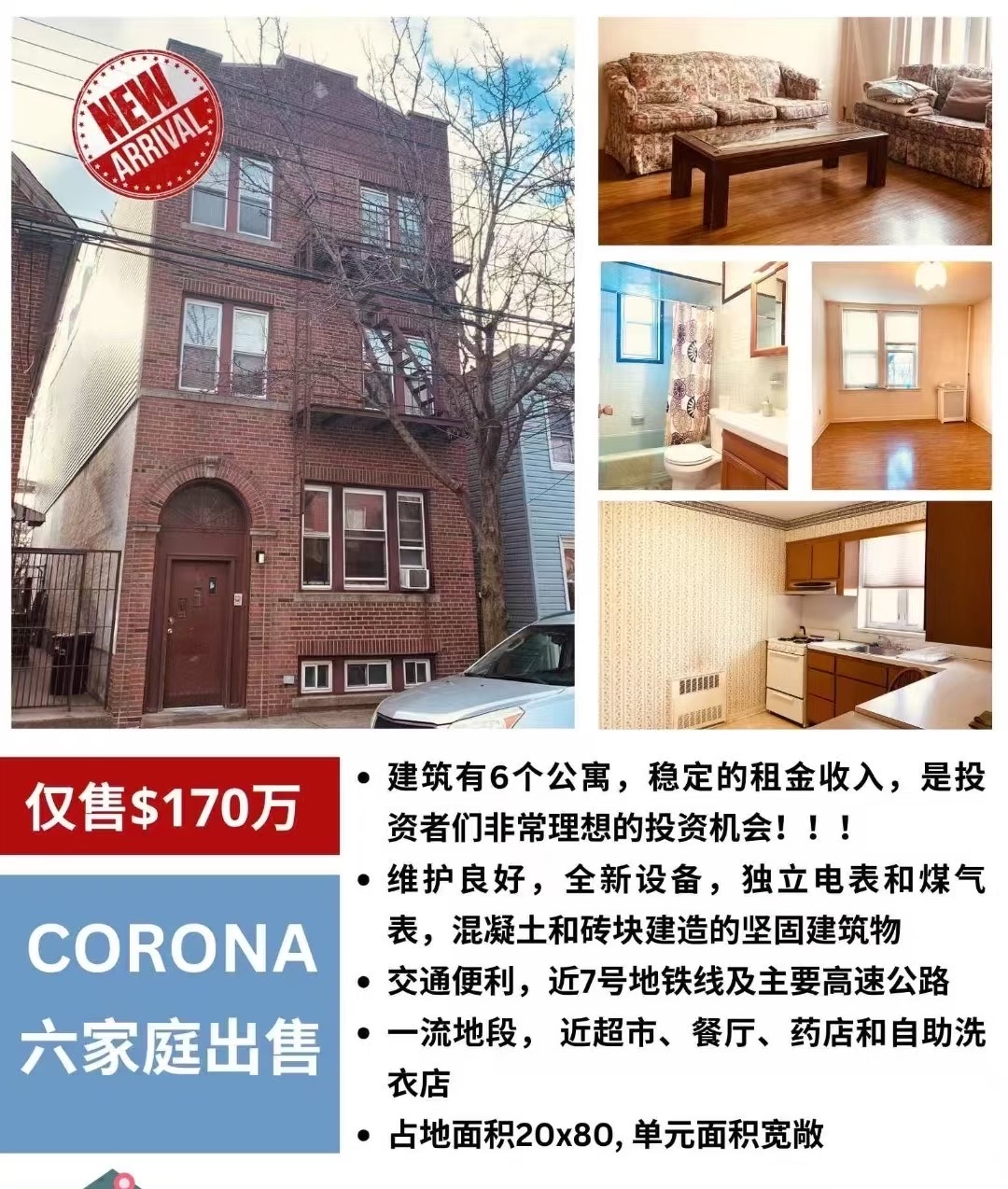 🔥可乐娜6家庭出售 全磚建築可樂娜,巨大6家庭,📍106-50th Avenue, Corona, NY 11368🎈地理位置優越; 環境悠閒;大窗明亮;🎈近商店、餐館、便利店,及 主要 高速公路 和 公共交通;🎈今年由上而下重金、精裝修,內外漂亮精緻;電、氣煤全部分離,独立计量表,各單位、地下室都 獨立出入!🎈1️⃣個1️⃣室1️⃣浴,5️⃣個2️⃣室1️⃣浴;🎈建築维护良好,混凝土、全砖,坚固建筑;🎈佔地:25x100,建築:20x80 = 每層1,600平呎;🎈房屋局 Zoning:R6B, C2-3;🎈租金:$11,000+ / 🈷️,所以租客多年完全准時繳租!年租淨收入可達$10萬2千➕‼️即刻 接手 收租!🎈回報率(CAP):高達6%‼️🎈自住投資、长期收益的最佳選擇,付款方式 靈活;🎈平均每個單位才$30萬😊比Coop還優惠;🎈叫價:$170万 917 293 8698