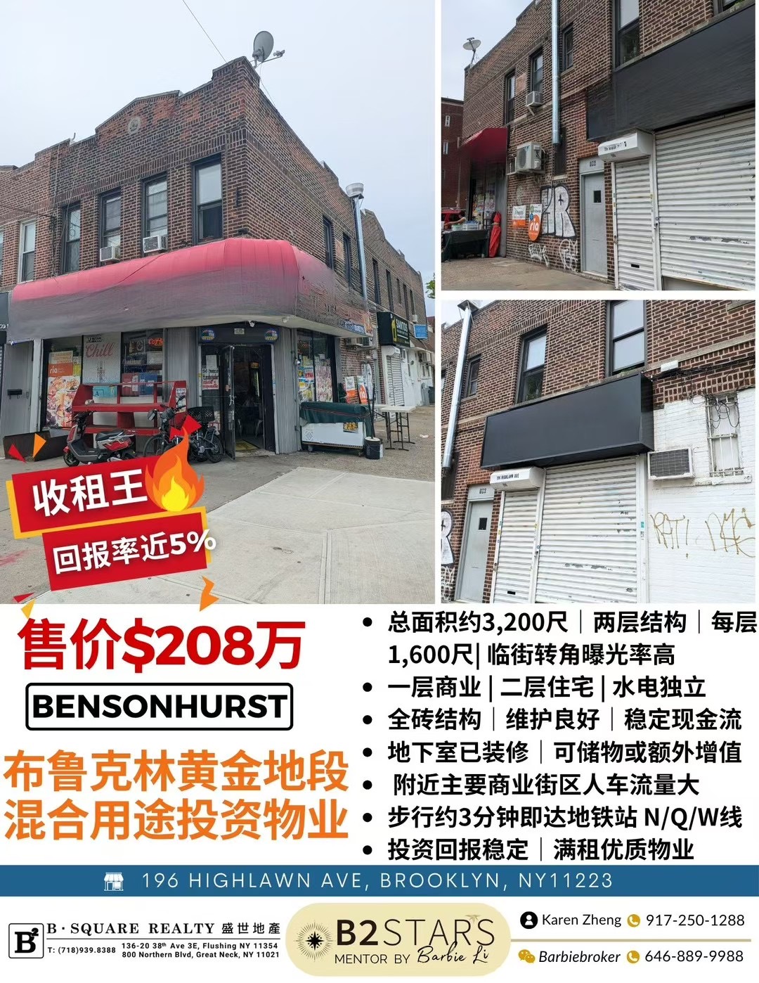 🎯【布鲁克林自住+投资神盘】你找的就是它!📍Brooklyn Kings 布鲁克林黄金角落地段,新上市 mix-use 物业💰售价仅 $208 万,稀缺结构:🏪 一楼三间旺铺 → 店铺可租可自营 并带一个独立的车库🏠 二楼两个独立住宅单元(前后分布)→ 自住+出租轻松实现!🧑🎓 好学区,高中评分 8 分!🚇 离地铁口只需步行 3 分钟!📐 总面积约 3,200 sqft,空间利用极佳