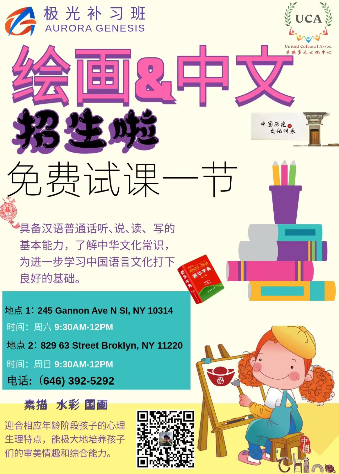 绘画&中文招生啦 免费试课一节829 63 Street Broklyn, NY 11220时间:周日 9:30AM-12PM电话:(646) 392-5292
