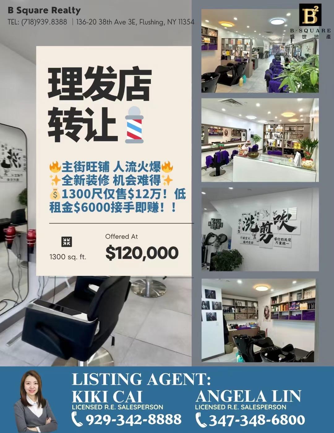 💈新装修理发店💈Elmhurst 全新装修理发店💰价格:$12万🏝️面积:1300尺🏡房租:$6000